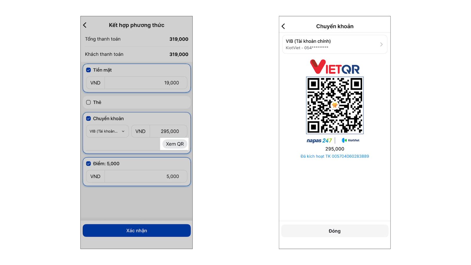 - Với hình thức thanh toán chuyển khoản, bạn có thể chọn Xem QR để khách quét mã thanh toán mà không cần phải nhập thông tin thủ công.