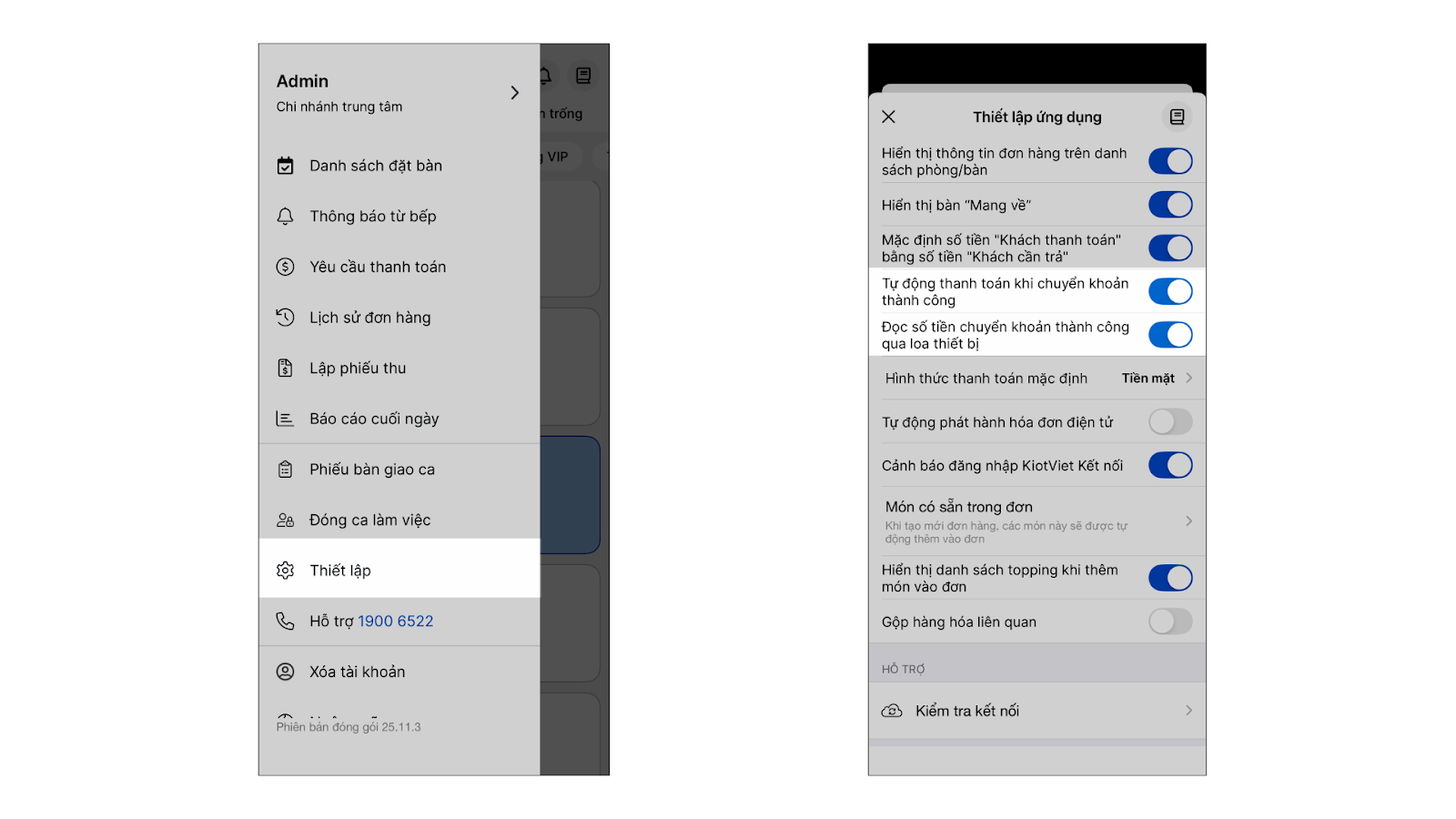 - Khi kích hoạt tiện ích: Đọc số tiền chuyển khoản thành công qua loa thiết bị trên màn hình Thu ngân → tùy chọn