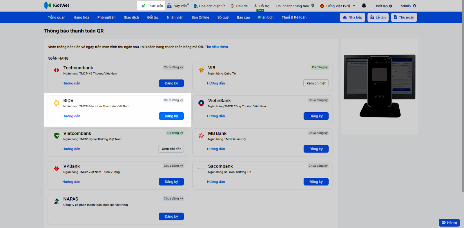 - Tài khoản admin của chủ gian hàng đăng nhập vào màn hình Quản lý, chọn mục Thanh toán và nhấn Đăng ký tại thẻ BIDV.