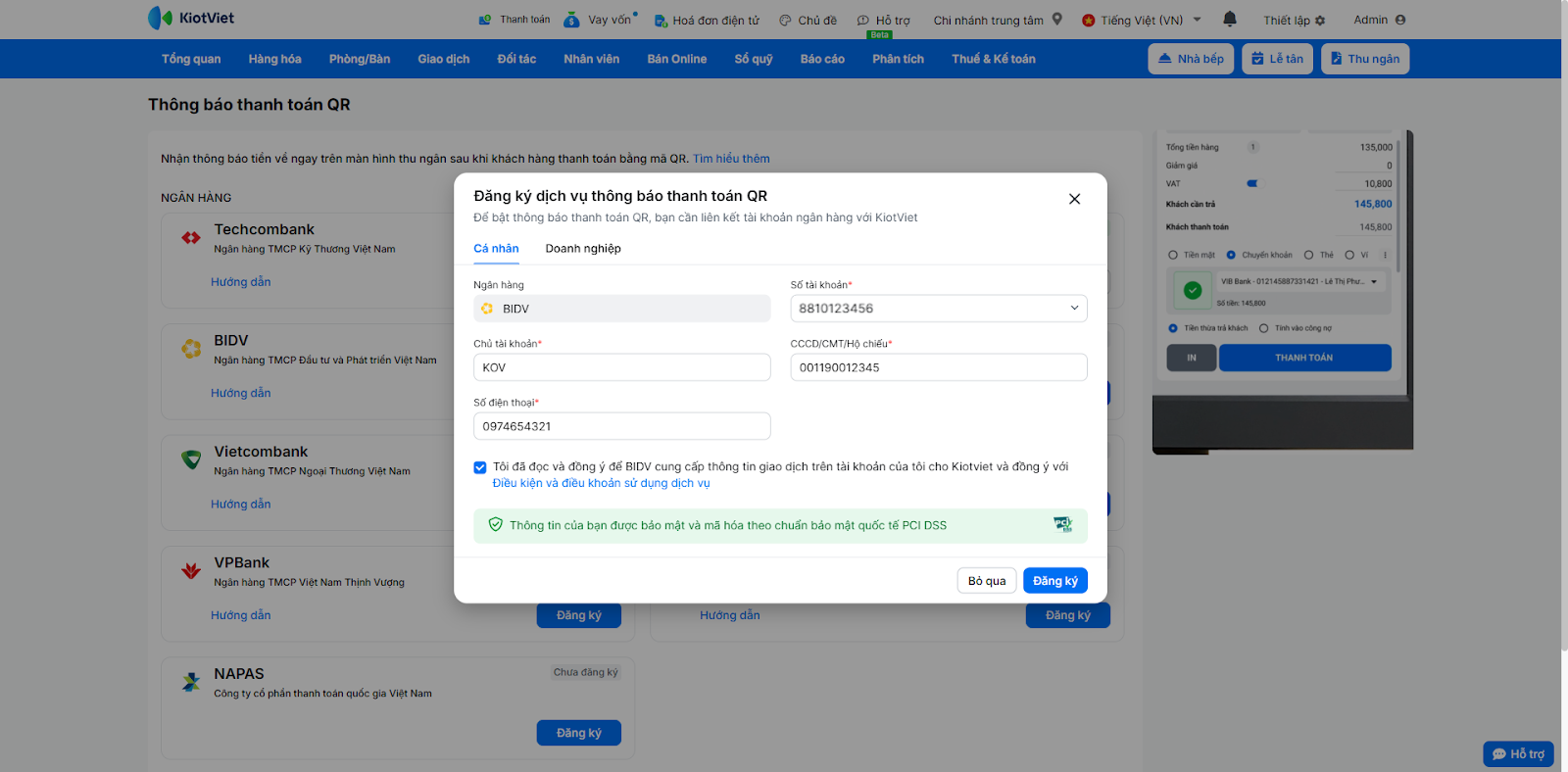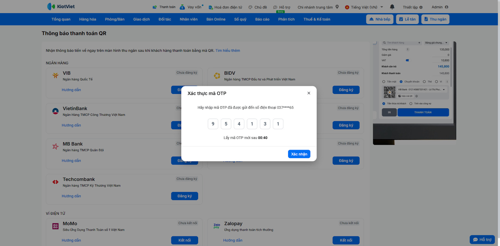 Để kích hoạt tính năng nhận thông báo thanh toán tự động, bạn cần đăng ký dịch vụ trực tiếp trên phần mềm KiotViet và xác thực bằng mã OTP.