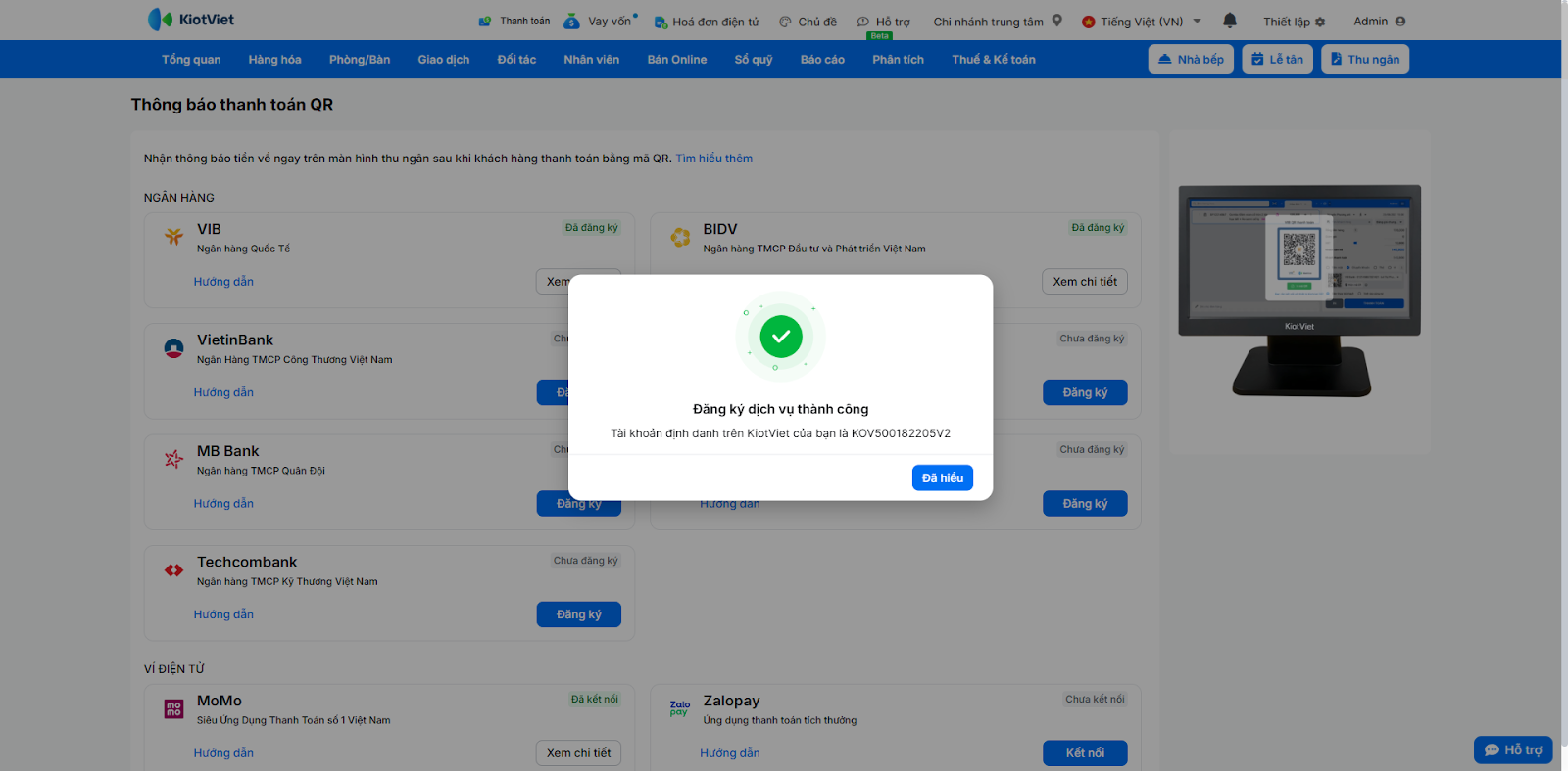 Khi khách hàng thực hiện thanh toán, hệ thống sẽ tự động hiển thị kết quả ngay trên màn hình Thu ngân để bạn xác nhận.