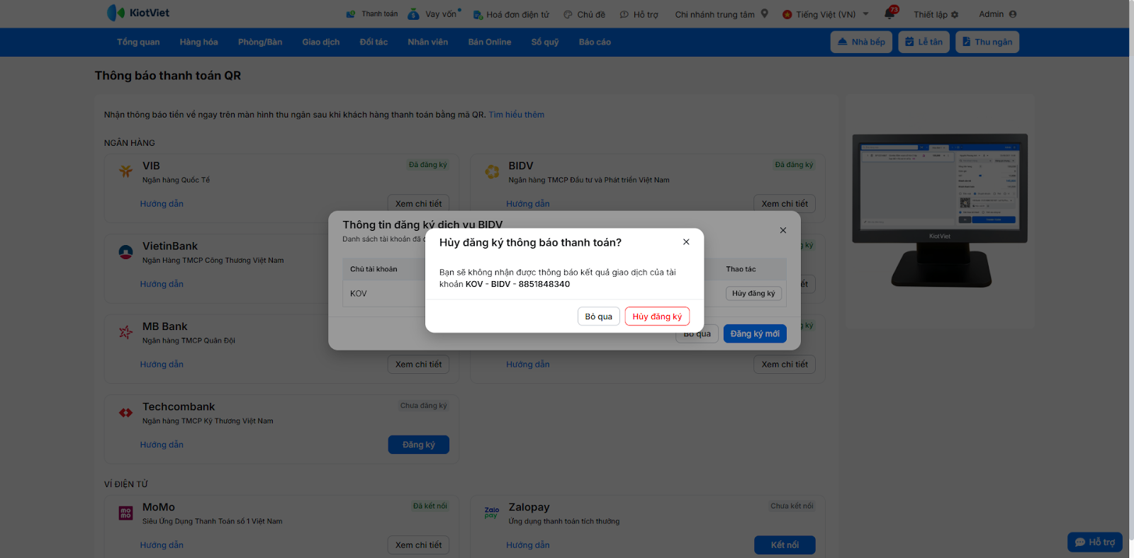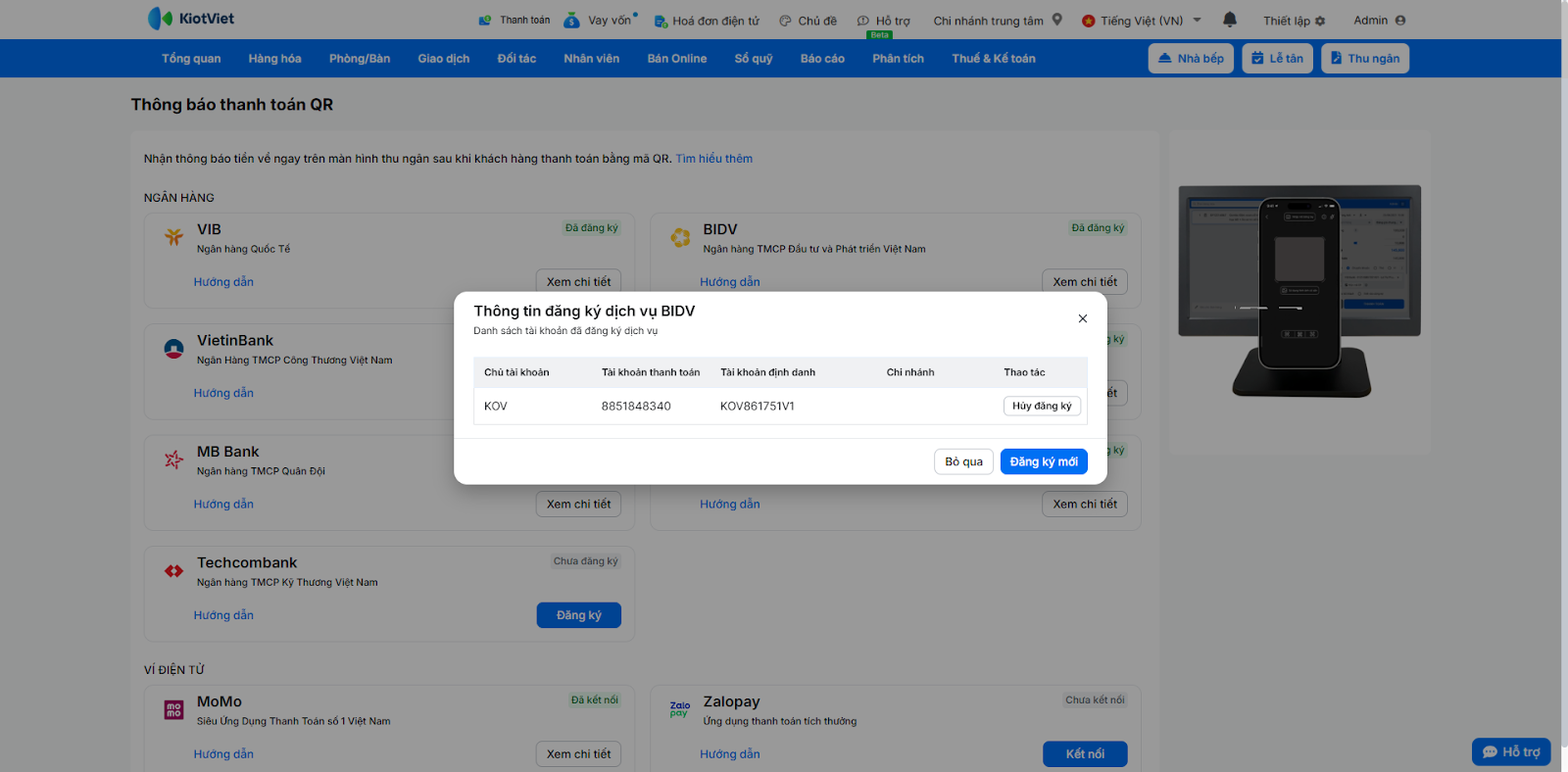- Tình huống: Khi bạn cần kiểm tra lại thông tin các tài khoản BIDV nào đang được kết nối để nhận thông báo tự động trên KiotViet.