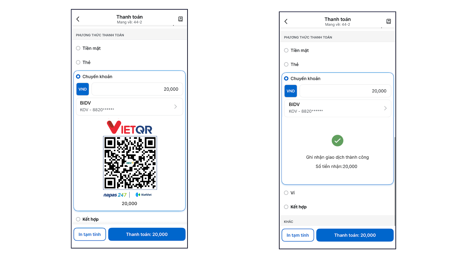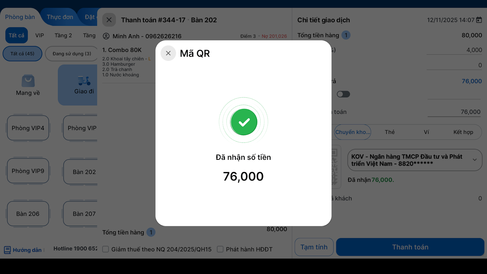 - Sau khi khách hàng quét mã và chuyển khoản thành công, màn hình Thu ngân sẽ ngay lập tức hiển thị thông báo kết quả giao dịch.