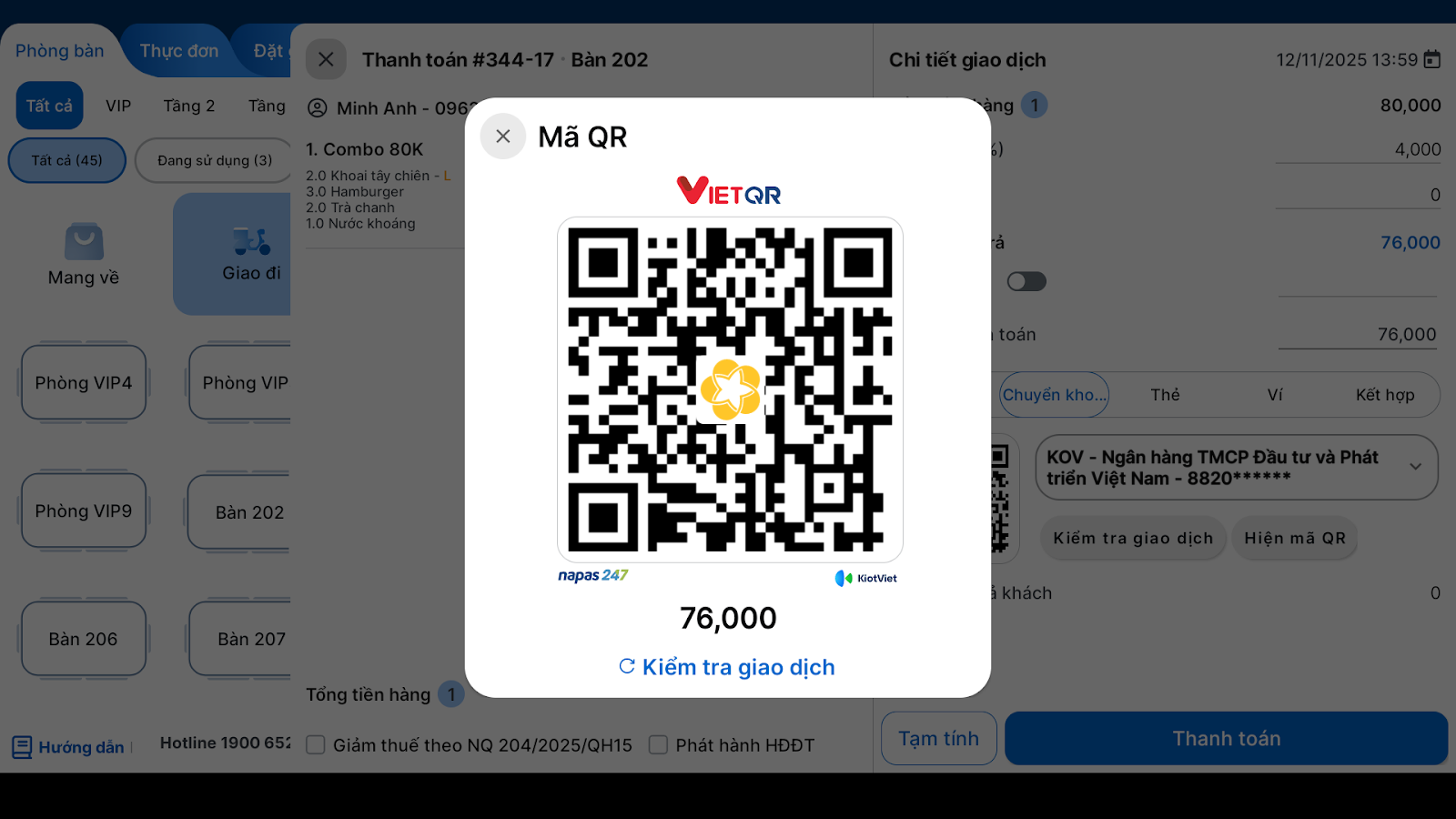 - Tăng trải nghiệm cho Thực khách: Cung cấp phương thức thanh toán hiện đại, an toàn và tiện lợi thông qua mã VietQR, giảm thời gian chờ đợi tại quầy thu ngân hoặc tại bàn.