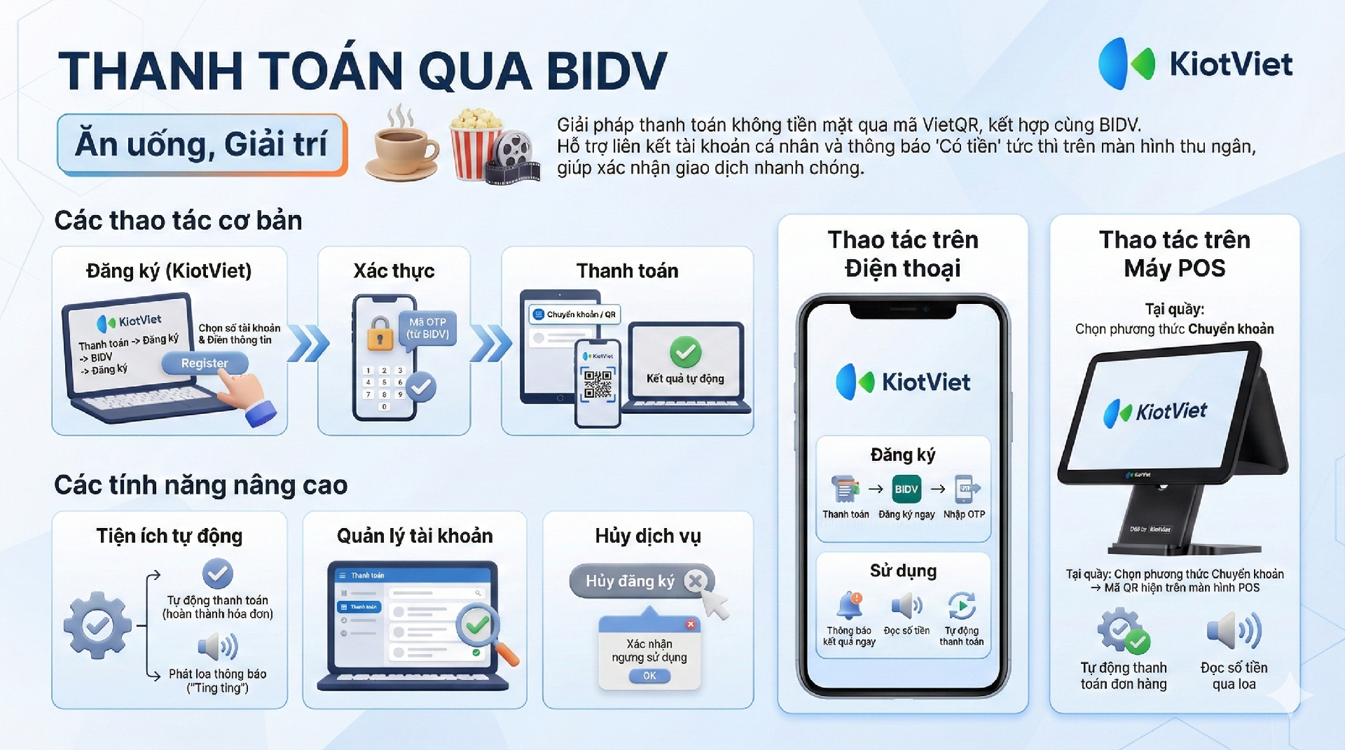 Nhằm hỗ trợ các nhà hàng, quán cafe thúc đẩy việc thanh toán phi tiền mặt, KiotViet kết hợp cùng ngân hàng BIDV đã ra mắt tính năng thanh toán chuyển khoản bằng phương pháp quét mã VietQR và nhận thông báo kết quả ngay trên phần mềm.
