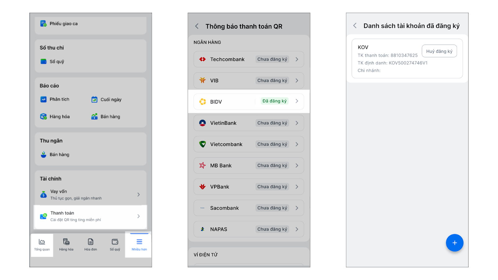 - Dành cho Chủ quán và Quản lý: Dễ dàng đăng ký và quản lý nhiều tài khoản BIDV trên cùng một gian hàng, giúp việc đối soát và theo dõi dòng tiền trở nên đơn giản và tập trung.