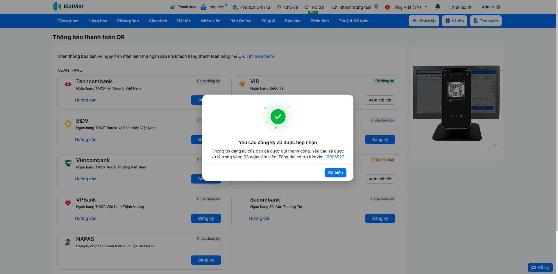 - Sau khi khách hàng quét mã và chuyển khoản thành công, màn hình Thu ngân sẽ ngay lập tức hiển thị thông báo kết quả giao dịch.
