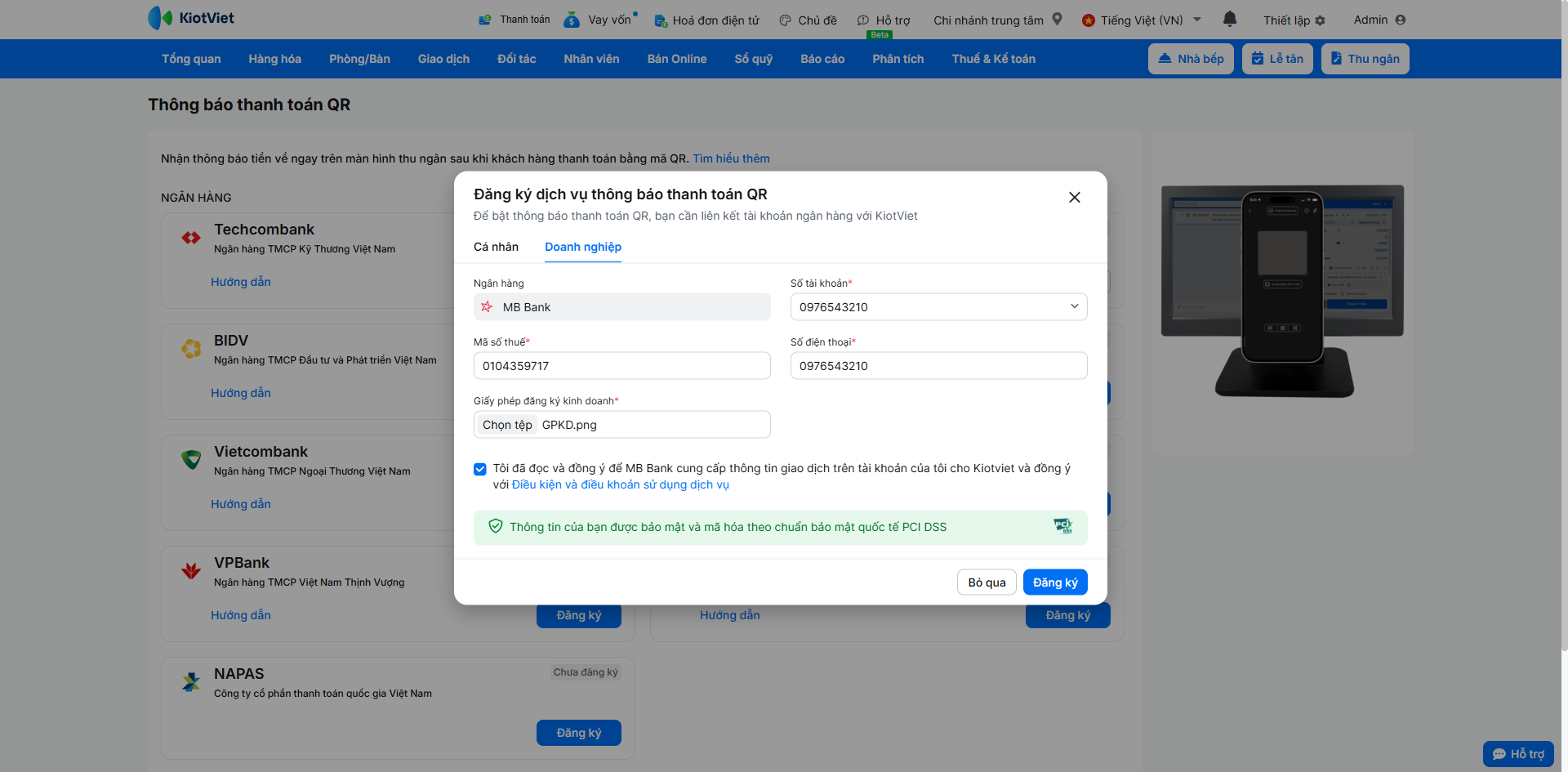 Nhằm hỗ trợ các nhà hàng, quán cafe thúc đẩy việc thanh toán phi tiền mặt, KiotViet kết hợp cùng ngân hàng MB Bank đã ra mắt tính năng thanh toán chuyển khoản bằng phương pháp quét mã VietQR và nhận thông báo kết quả ngay trên phần mềm.