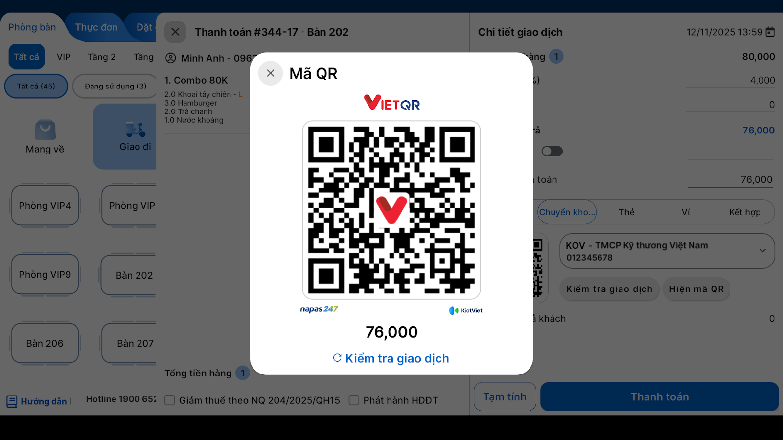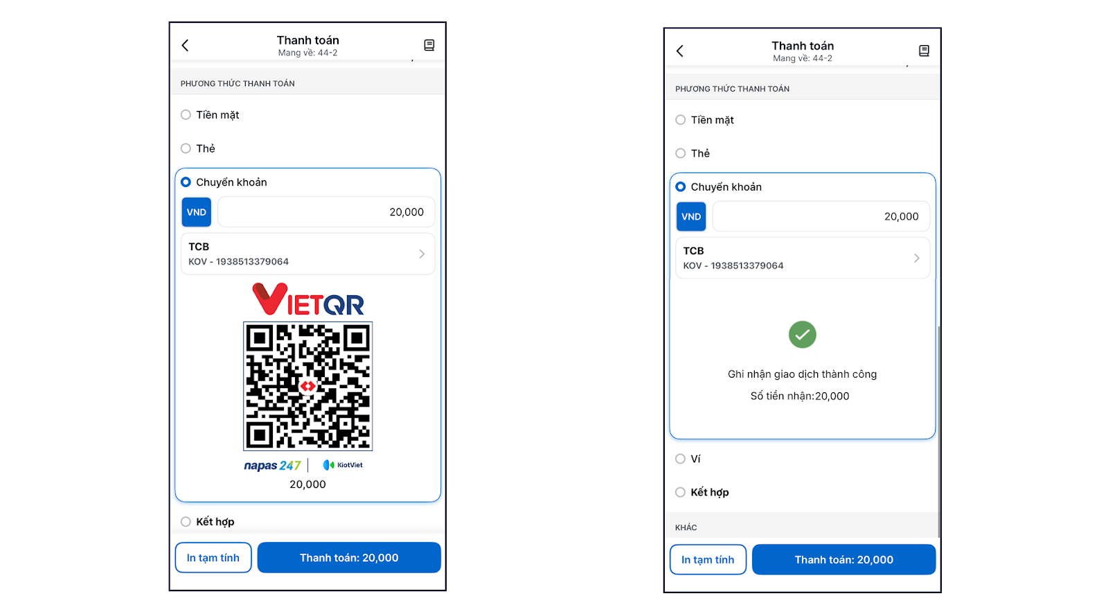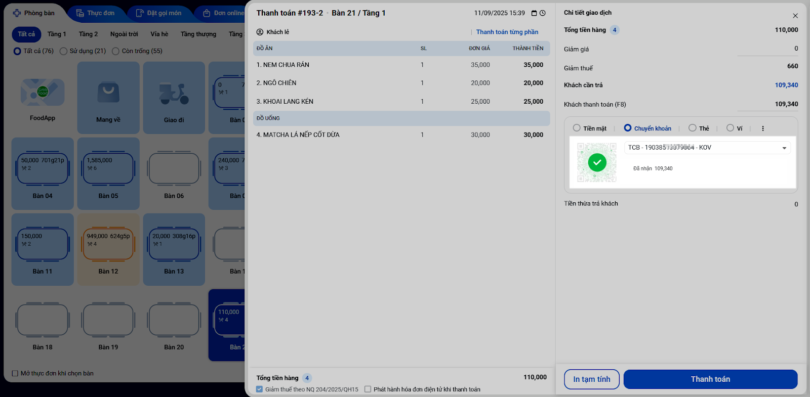 - Khi tạo hóa đơn trên ứng dụng KiotViet Máy POS Nhà hàng, chọn phương thức thanh toán là Chuyển khoản và chọn tài khoản Techcombank đã liên kết.