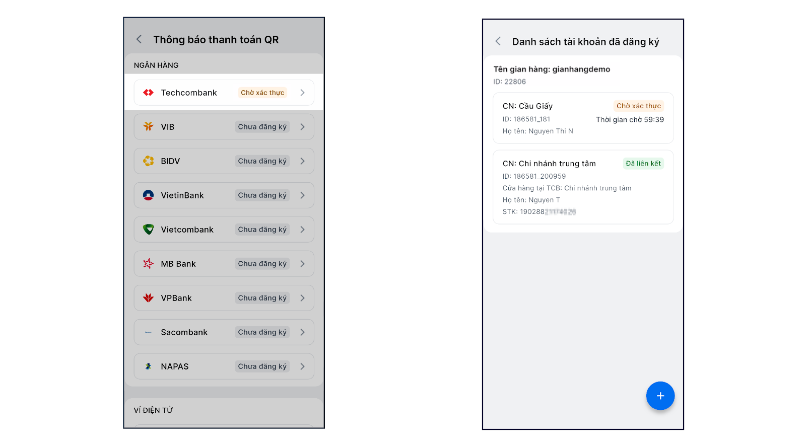 - Ứng dụng sẽ hiển thị danh sách các chi nhánh cùng trạng thái liên kết (Thành công, Thất bại, Chờ xác thực). Bạn có thể nhấn cộng