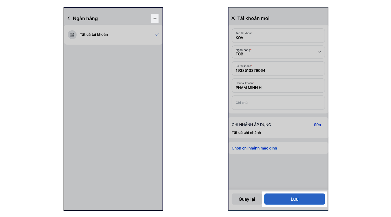-> điền thông tin tài khoản Techcombank của bạn và nhấn Lưu.