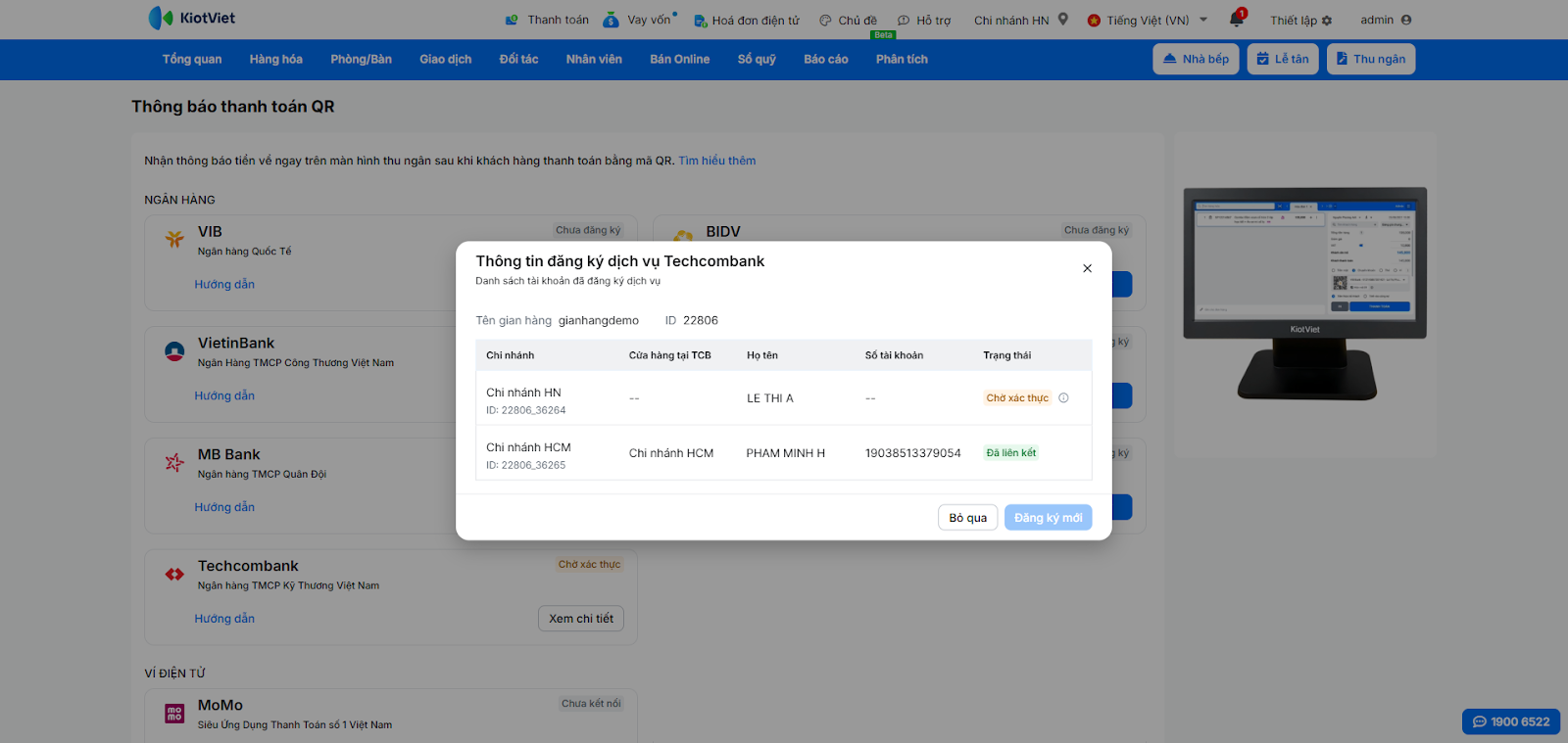 Sau khi liên kết thành công, bước tiếp theo là khai báo số tài khoản này trong KiotViet để hệ thống nhận diện khi thanh toán.