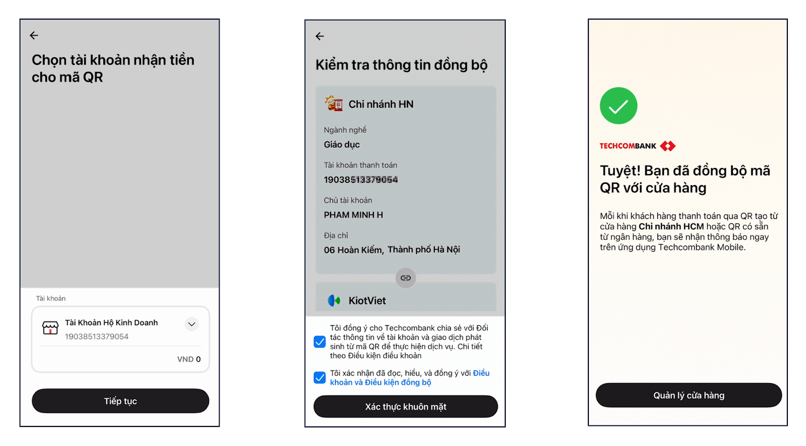 - Giúp chủ cửa hàng và quản lý: Dễ dàng đăng ký và quản lý việc liên kết tài khoản Techcombank cho từng chi nhánh. Một tài khoản ngân hàng có thể sử dụng cho nhiều chi nhánh của cùng một gian hàng.