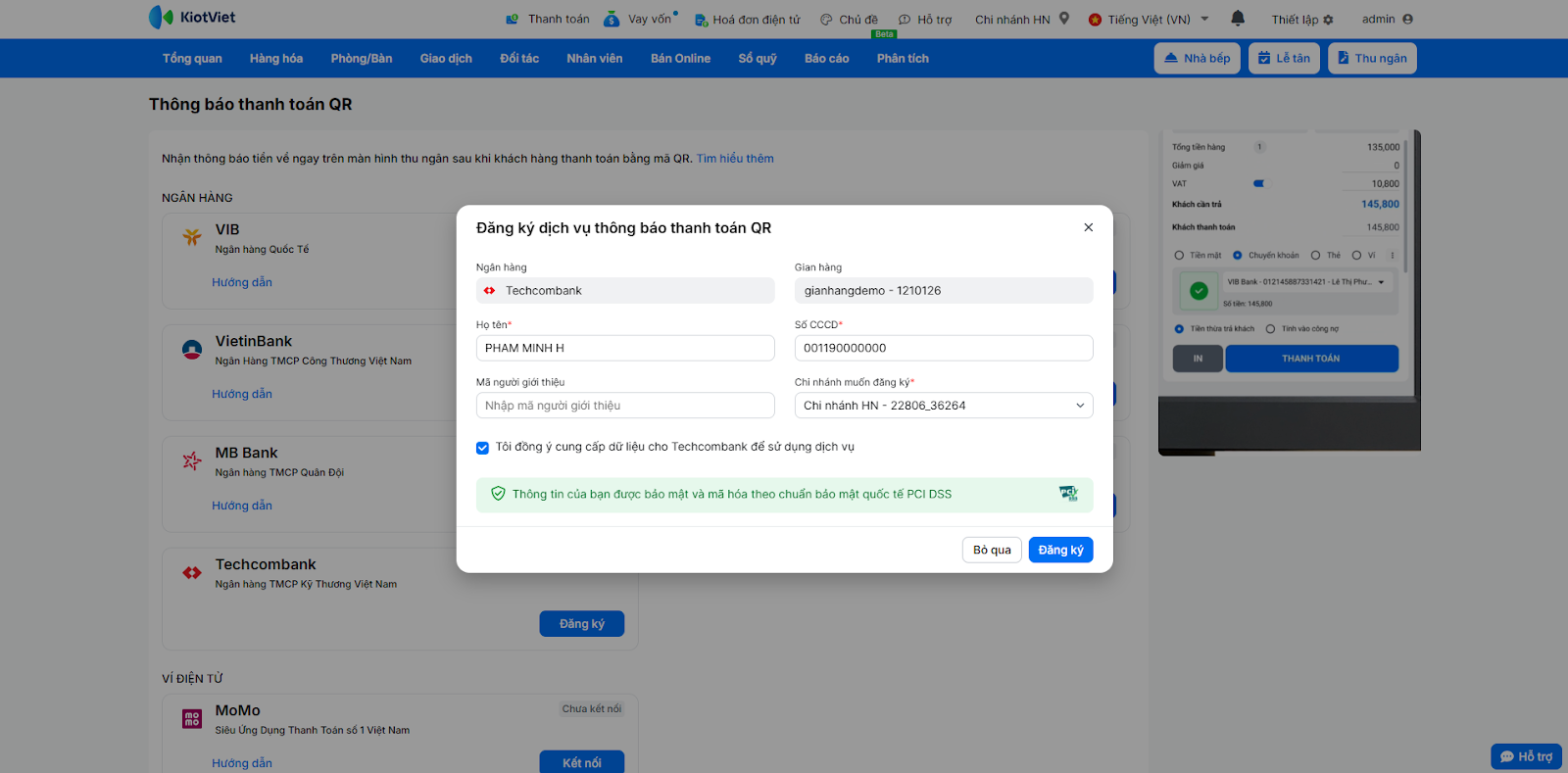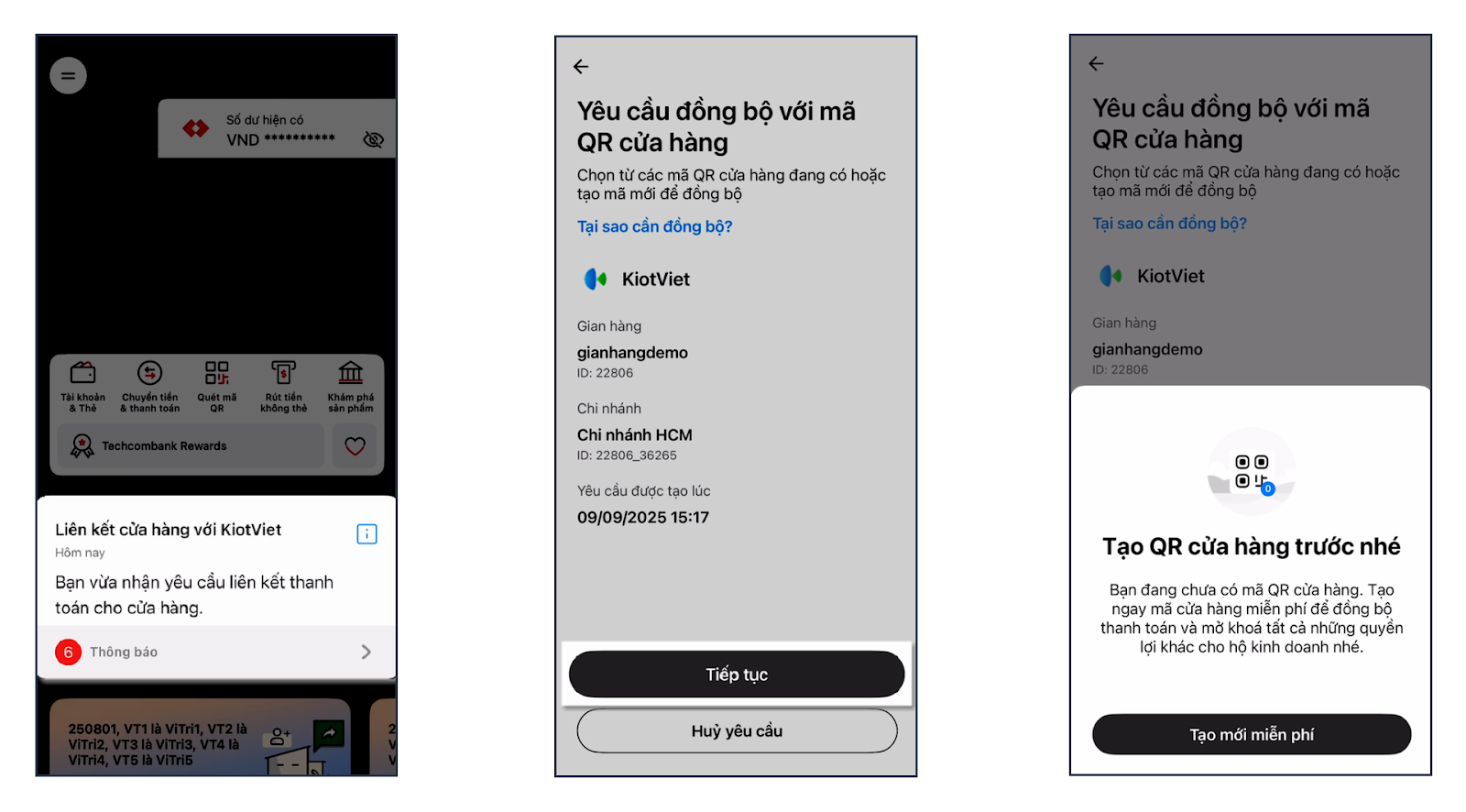Để kích hoạt tính năng nhận thông báo thanh toán tự động, bạn cần hoàn tất việc đăng ký dịch vụ trên KiotViet và xác thực liên kết trên ứng dụng Techcombank Mobile.