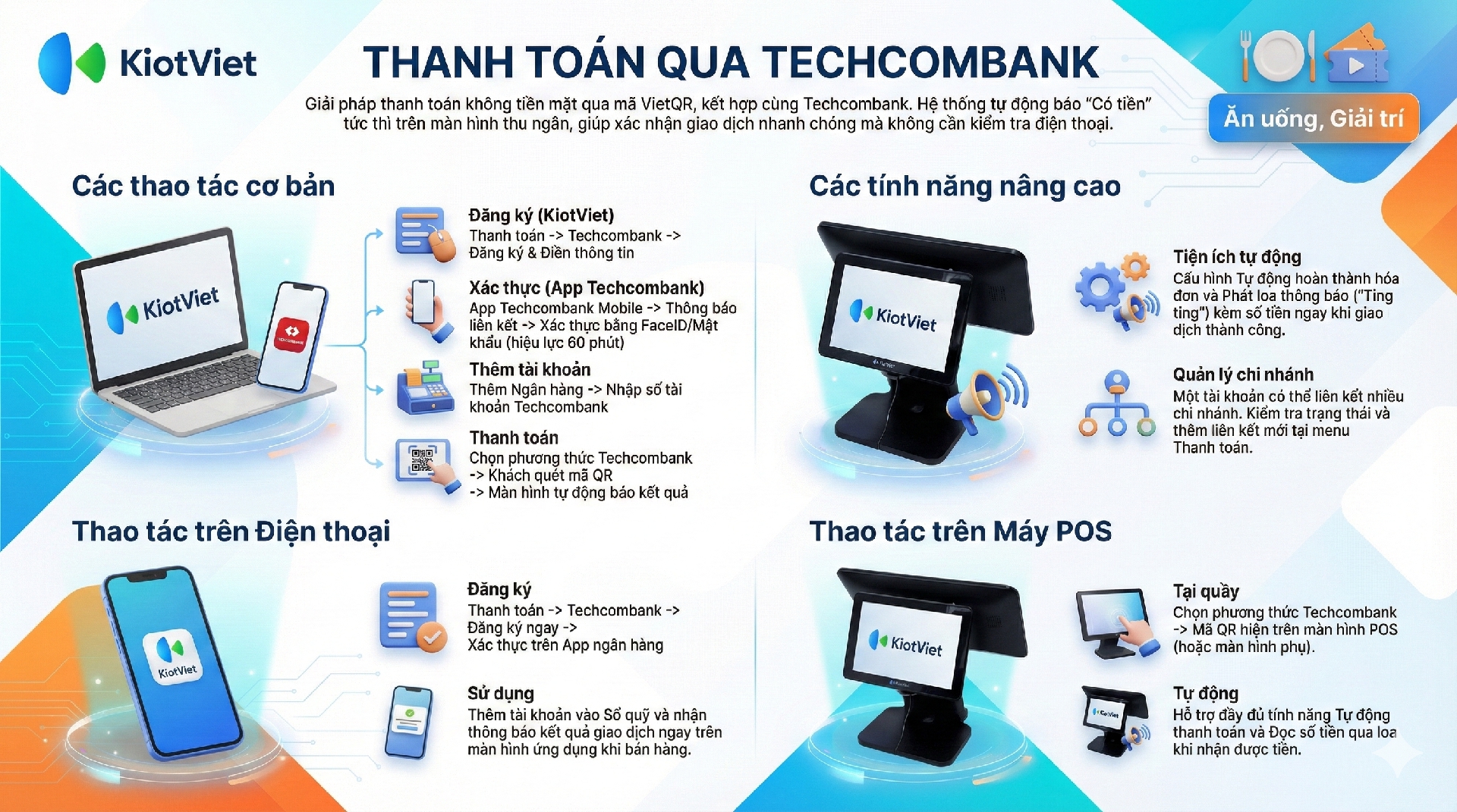 Tóm tắt luồng hoạt động: Về cơ bản, luồng hoạt động của tính năng bao gồm 3 bước chính: 1. Kích hoạt dịch vụ nhận thông báo thanh toán QR của Techcombank -> 2. Thêm tài khoản Techcombank trên KiotViet -> 3. Nhận thông báo kết quả giao dịch trên màn hình Thu ngân.