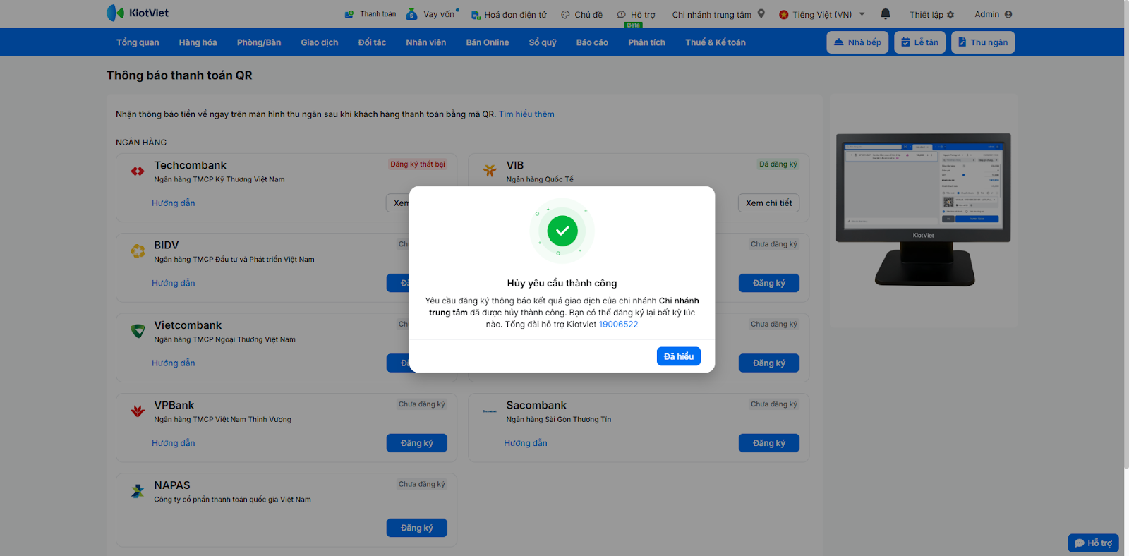 Sau khi liên kết thành công, bước tiếp theo là khai báo số tài khoản này trong KiotViet để hệ thống nhận diện khi thanh toán.