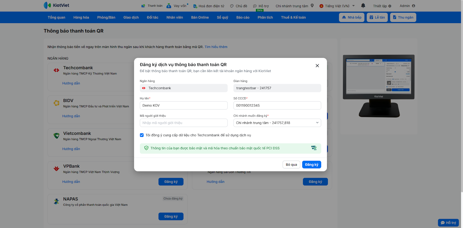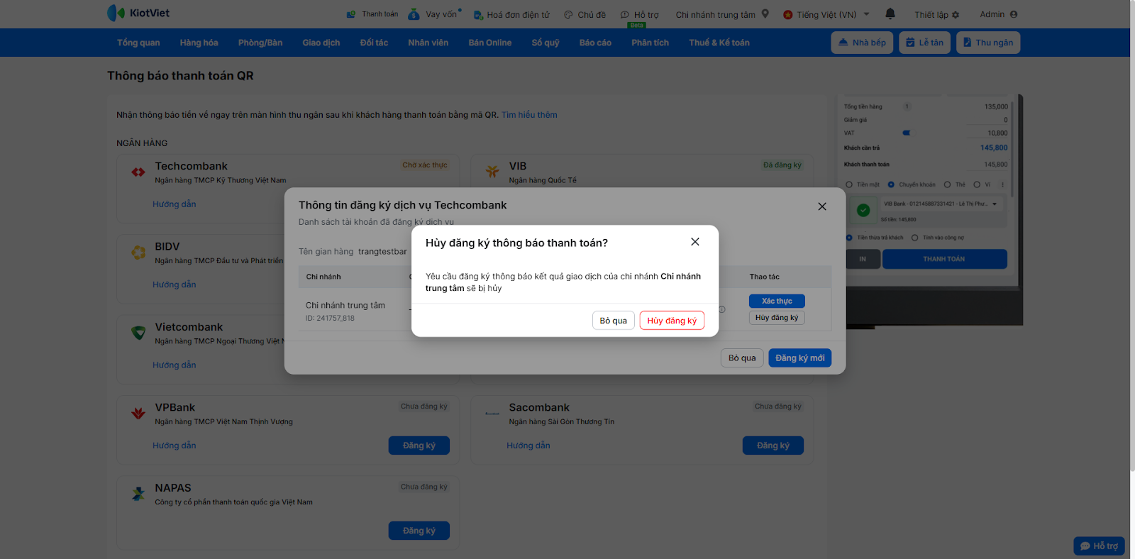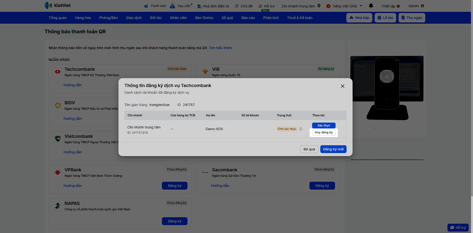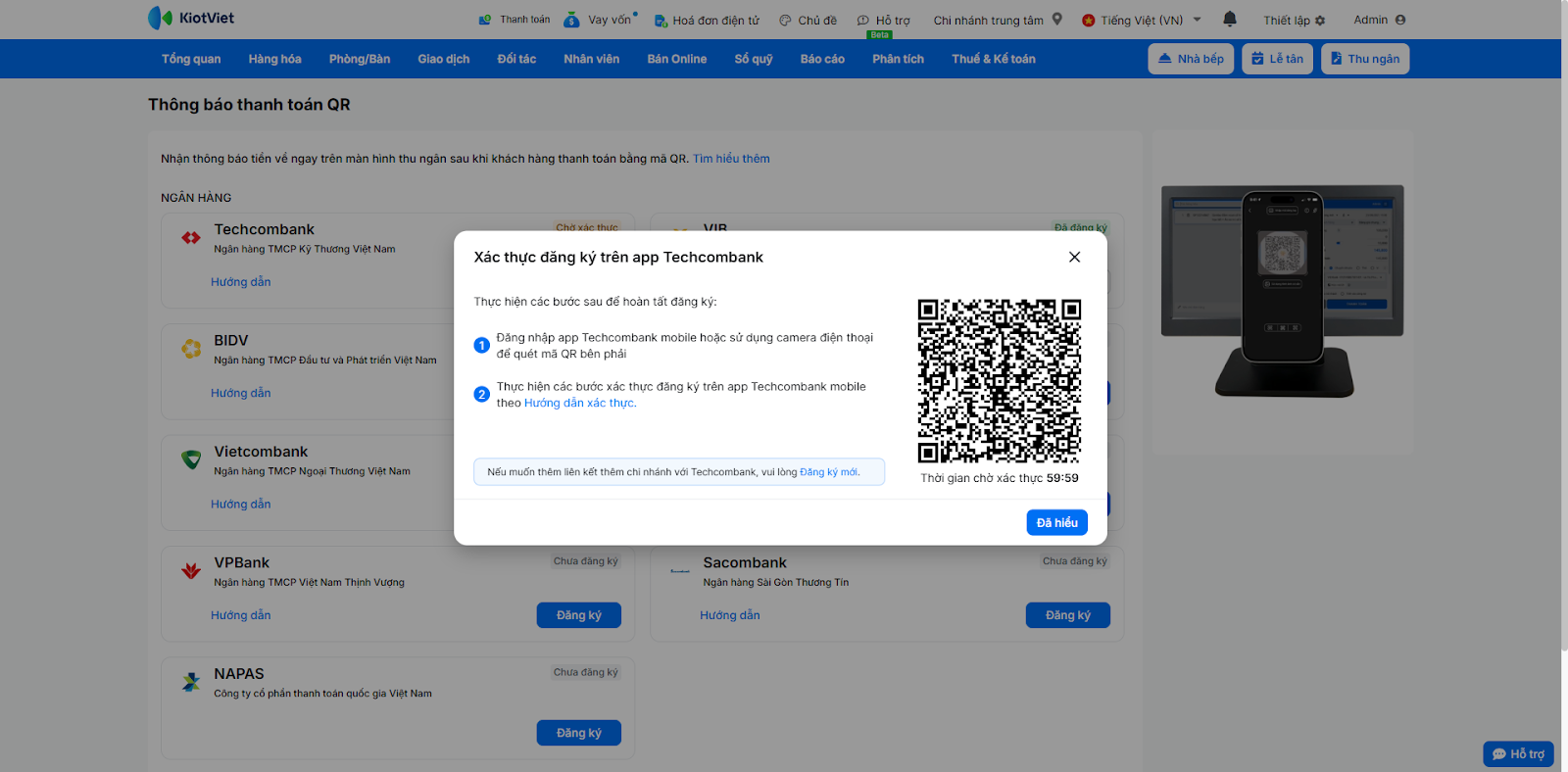 Để kích hoạt tính năng nhận thông báo thanh toán tự động, bạn cần hoàn tất việc đăng ký dịch vụ trên KiotViet và xác thực liên kết trên ứng dụng Techcombank Mobile.