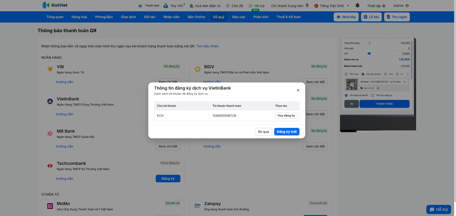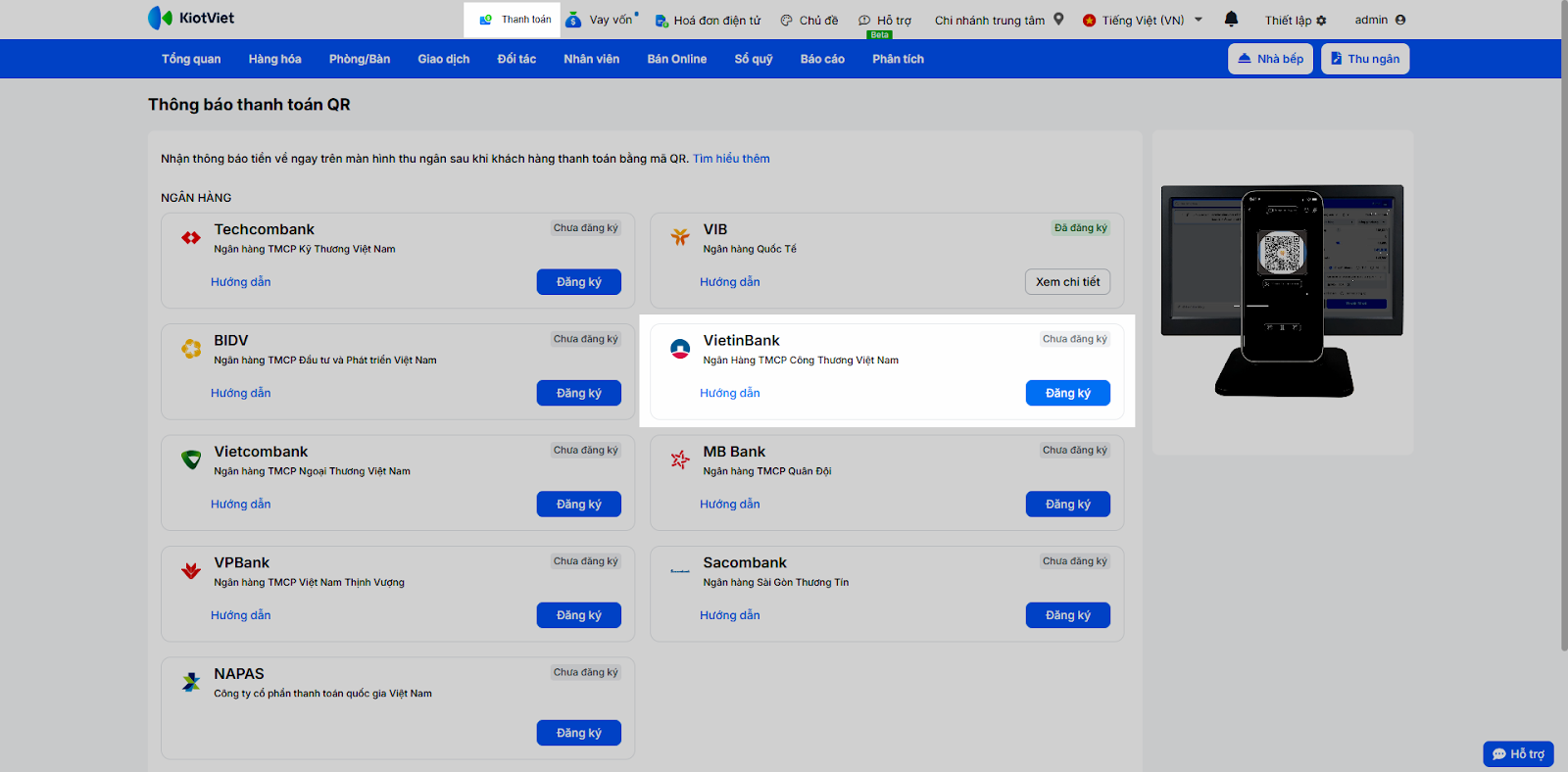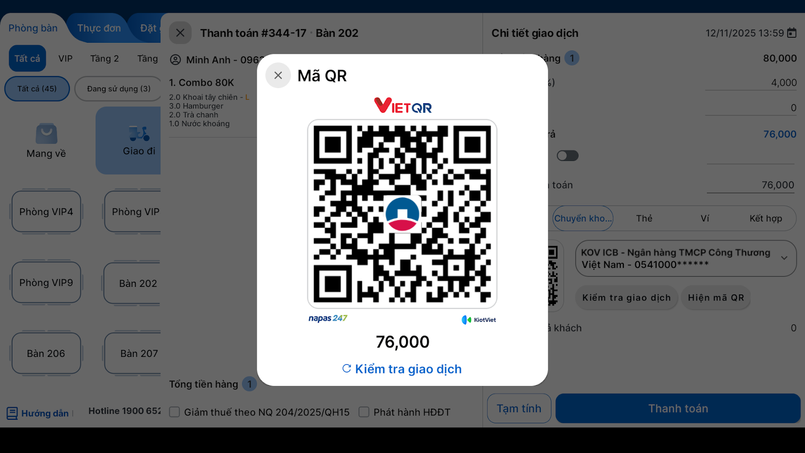 Nhằm hỗ trợ các nhà hàng, quán cafe thúc đẩy việc thanh toán phi tiền mặt, KiotViet kết hợp cùng ngân hàng VietinBank đã ra mắt tính năng thanh toán chuyển khoản bằng phương pháp quét mã VietQR và nhận thông báo kết quả ngay trên phần mềm.