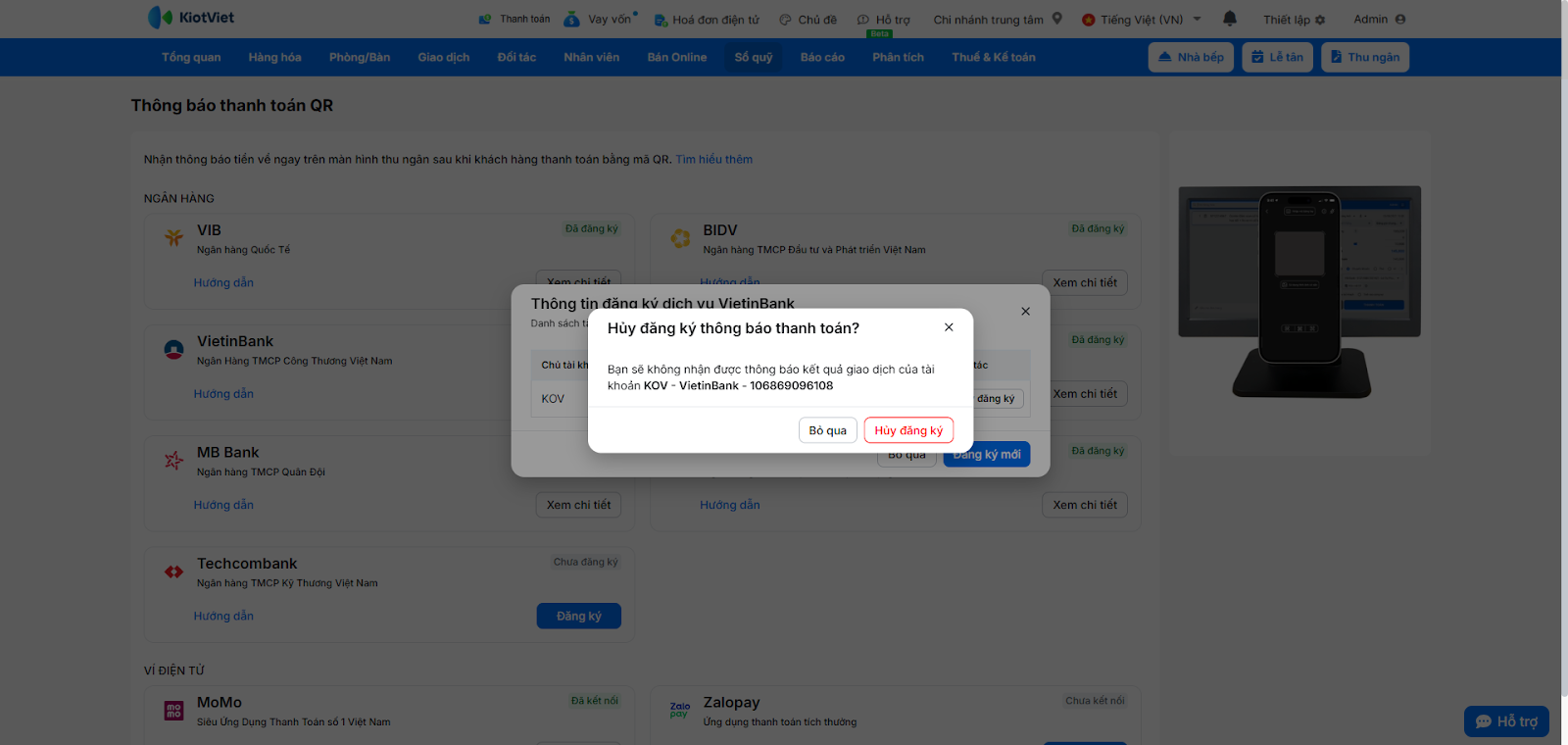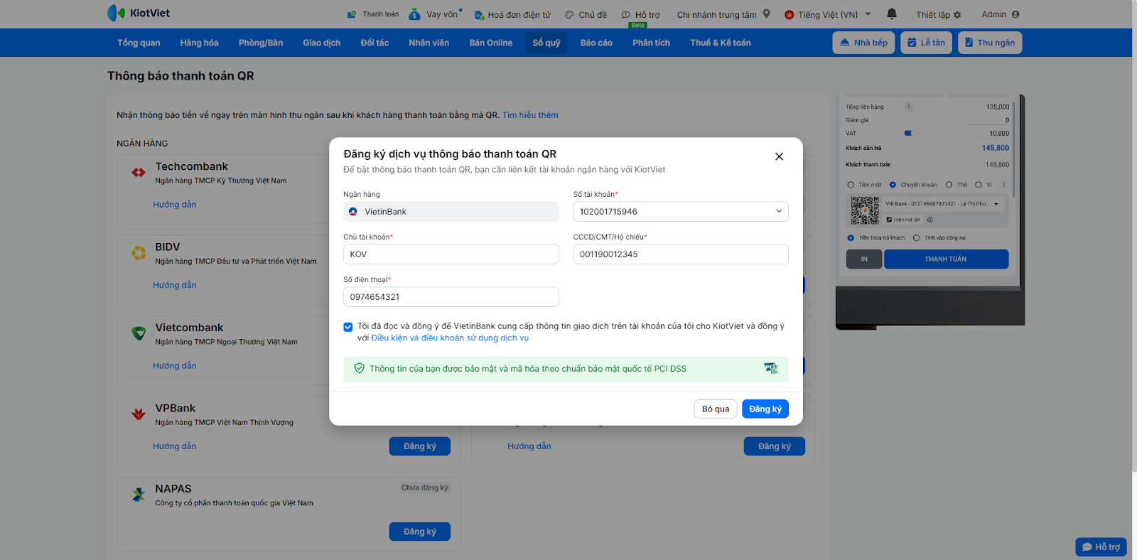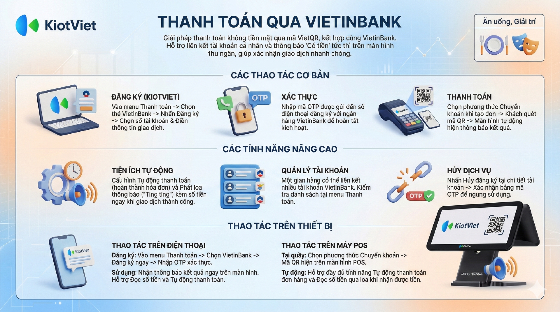 Nhằm hỗ trợ các nhà hàng, quán cafe thúc đẩy việc thanh toán phi tiền mặt, KiotViet kết hợp cùng ngân hàng VietinBank đã ra mắt tính năng thanh toán chuyển khoản bằng phương pháp quét mã VietQR và nhận thông báo kết quả ngay trên phần mềm.