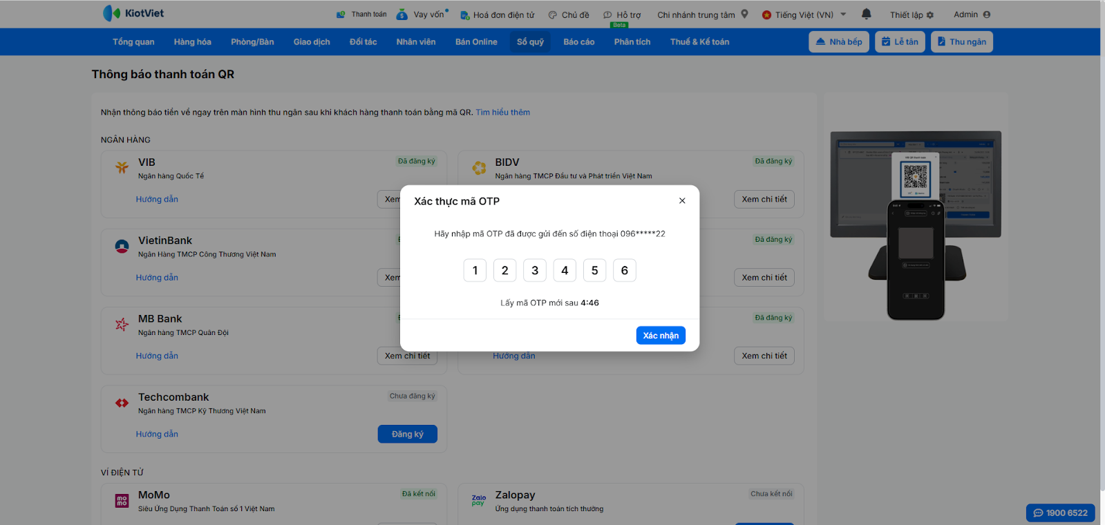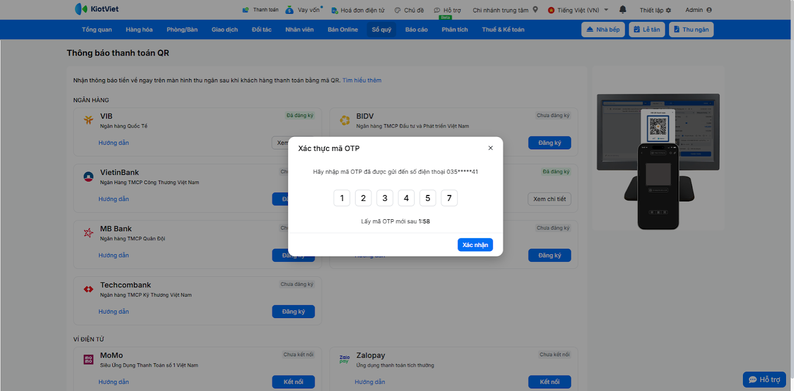 - Bạn nhập mã OTP này vào màn hình trên KiotViet để hoàn tất việc xác thực.