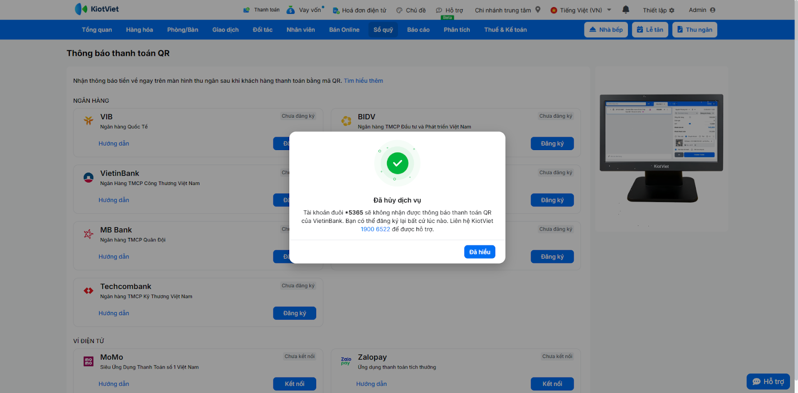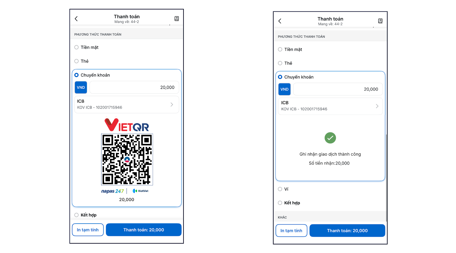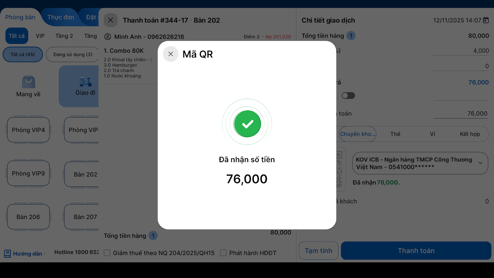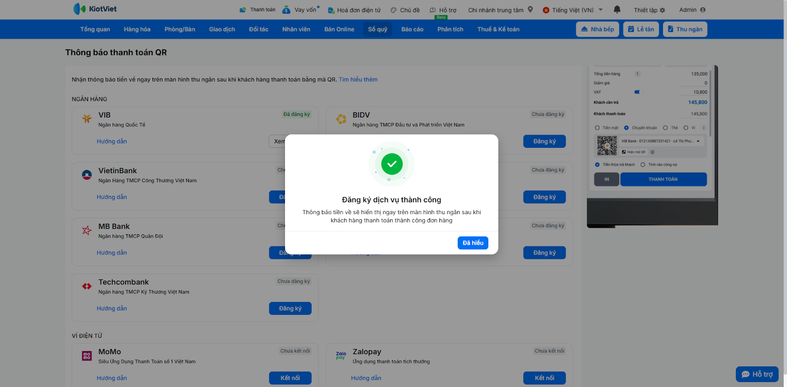 - Sau khi khách hàng quét mã và chuyển khoản thành công, màn hình Thu ngân sẽ ngay lập tức hiển thị thông báo kết quả giao dịch.