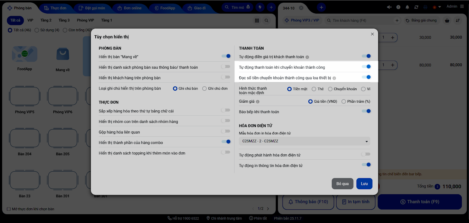 - Khi tạo hóa đơn trên ứng dụng KiotViet Máy POS Nhà hàng, chọn phương thức thanh toán là Chuyển khoản và chọn tài khoản Vietinbank đã liên kết.