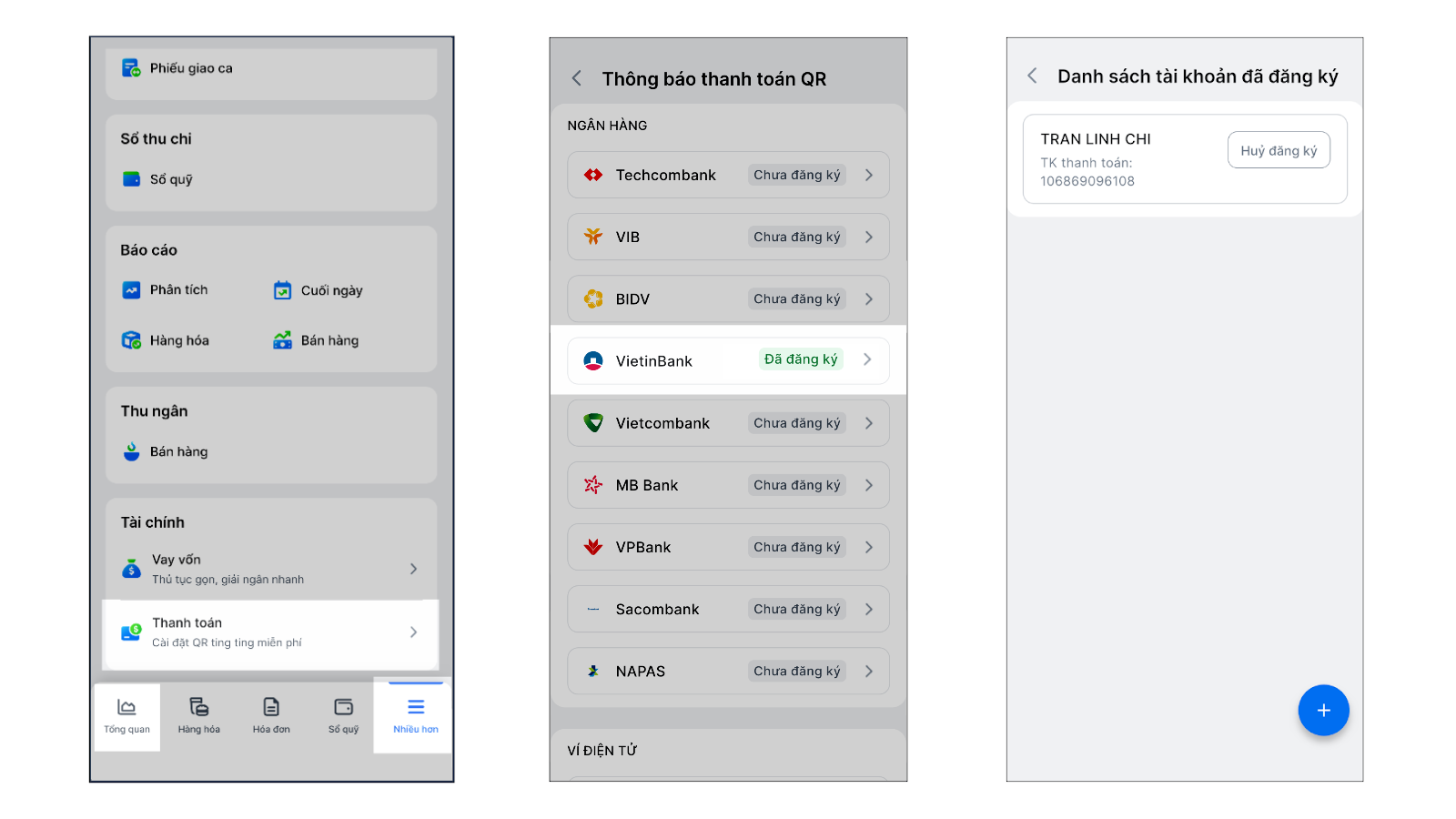 - Hỗ trợ Nhân viên Thu ngân/Phục vụ: Nhận thông báo thanh toán thành công ngay lập tức trên màn hình thu ngân hoặc ứng dụng di động, giúp xác nhận giao dịch nhanh chóng mà không cần kiểm tra trên ứng dụng ngân hàng.