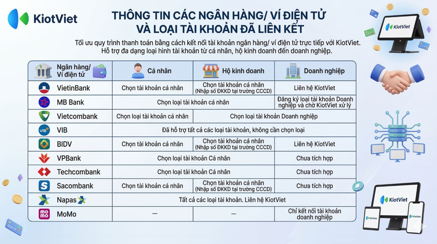 Lưu ý: Tính năng nâng cao này áp dụng cho các ngân hàng và ví điện tử có hợp tác với KiotViet: VIB, BIDV, Vietinbank, Vietcombank, MB Bank, VPbank, Techcombank, Sacombank, Momo,…. Để xem hướng dẫn sử dụng chi tiết, bạn vui lòng tham khảo các bài viết hướng dẫn sử dụng khác trong mục Thanh toán.