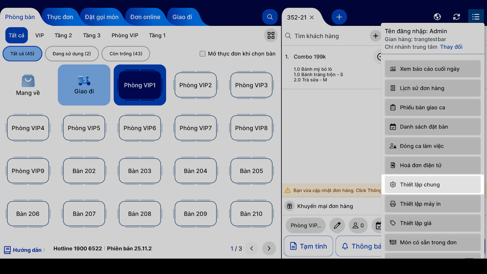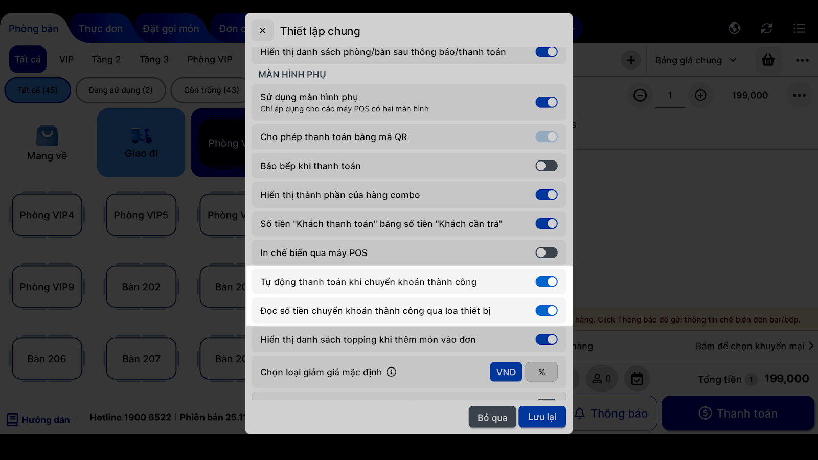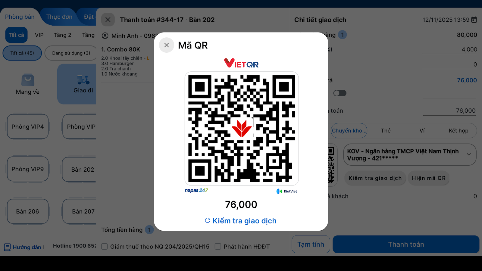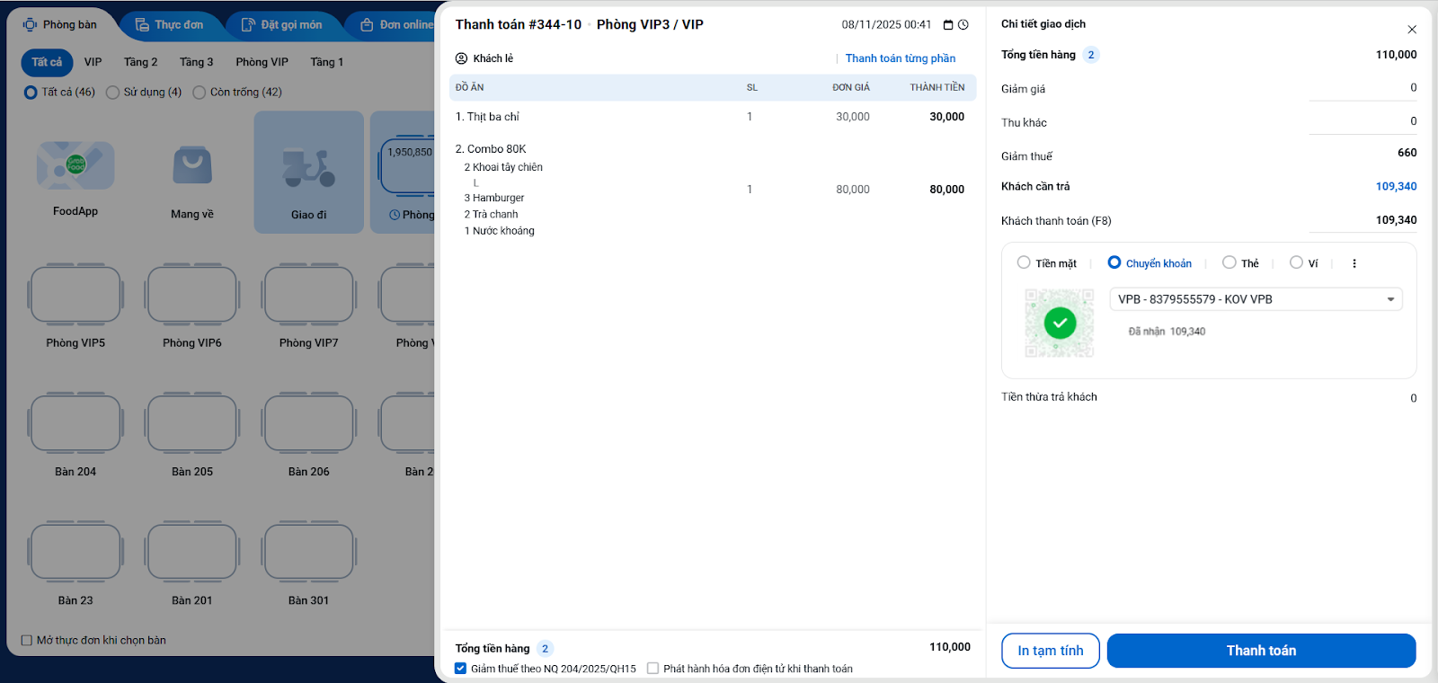 - Khi tạo hóa đơn trên ứng dụng KiotViet Máy POS Nhà hàng, chọn phương thức thanh toán là Chuyển khoản và chọn tài khoản VPBank đã liên kết.