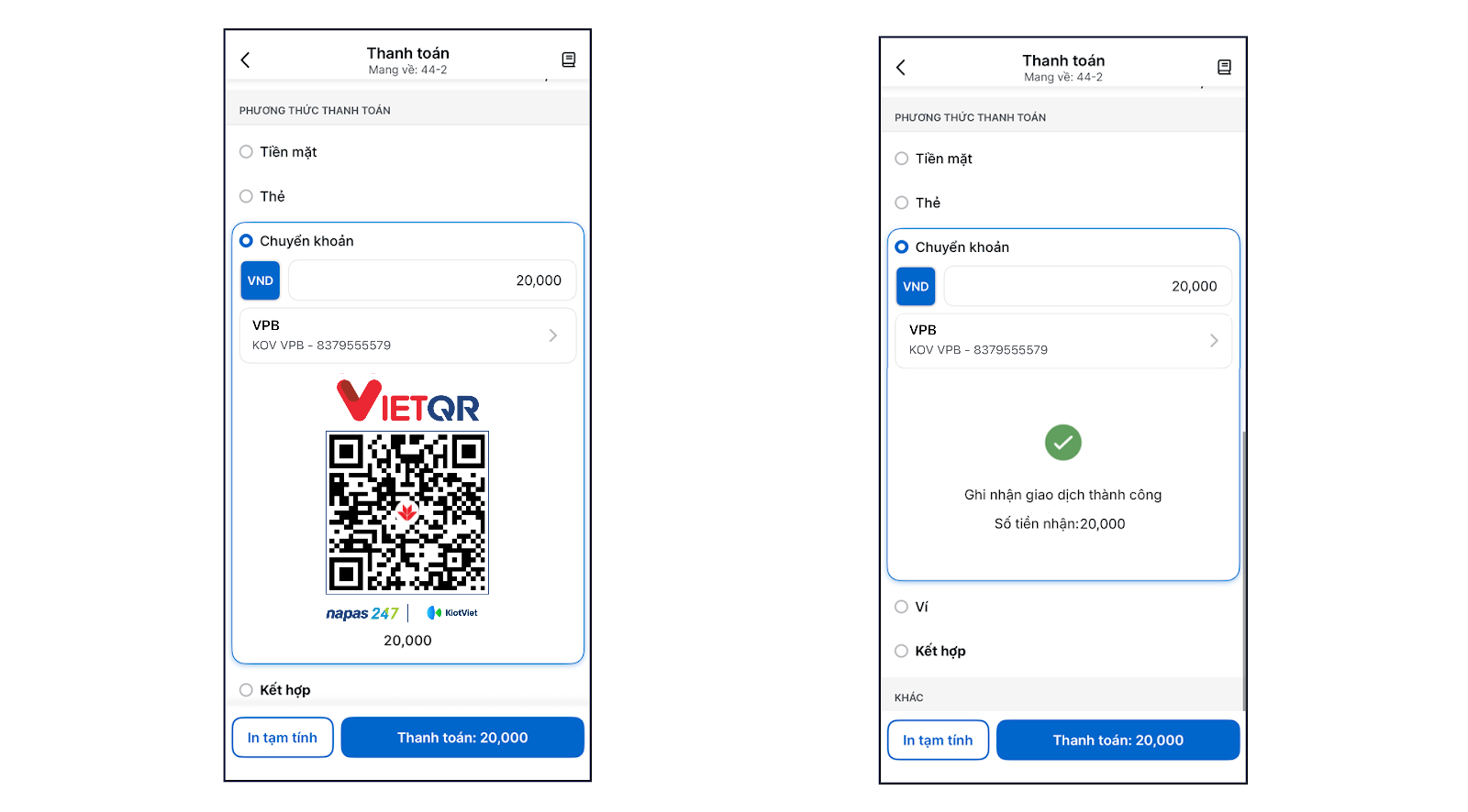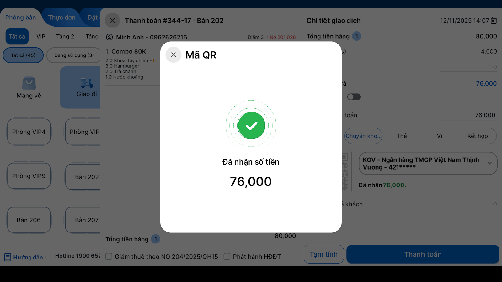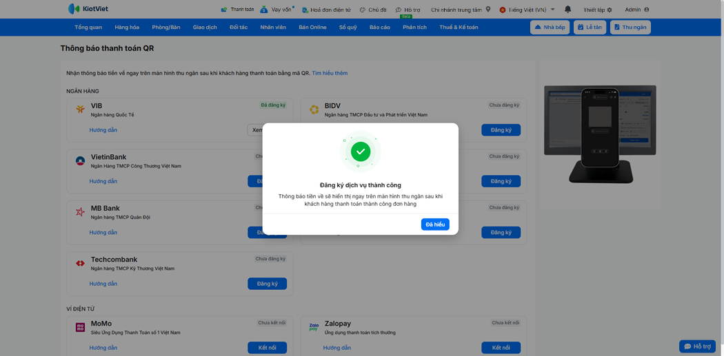 - Sau khi khách hàng quét mã và chuyển khoản thành công, màn hình Thu ngân sẽ ngay lập tức hiển thị thông báo kết quả giao dịch.
