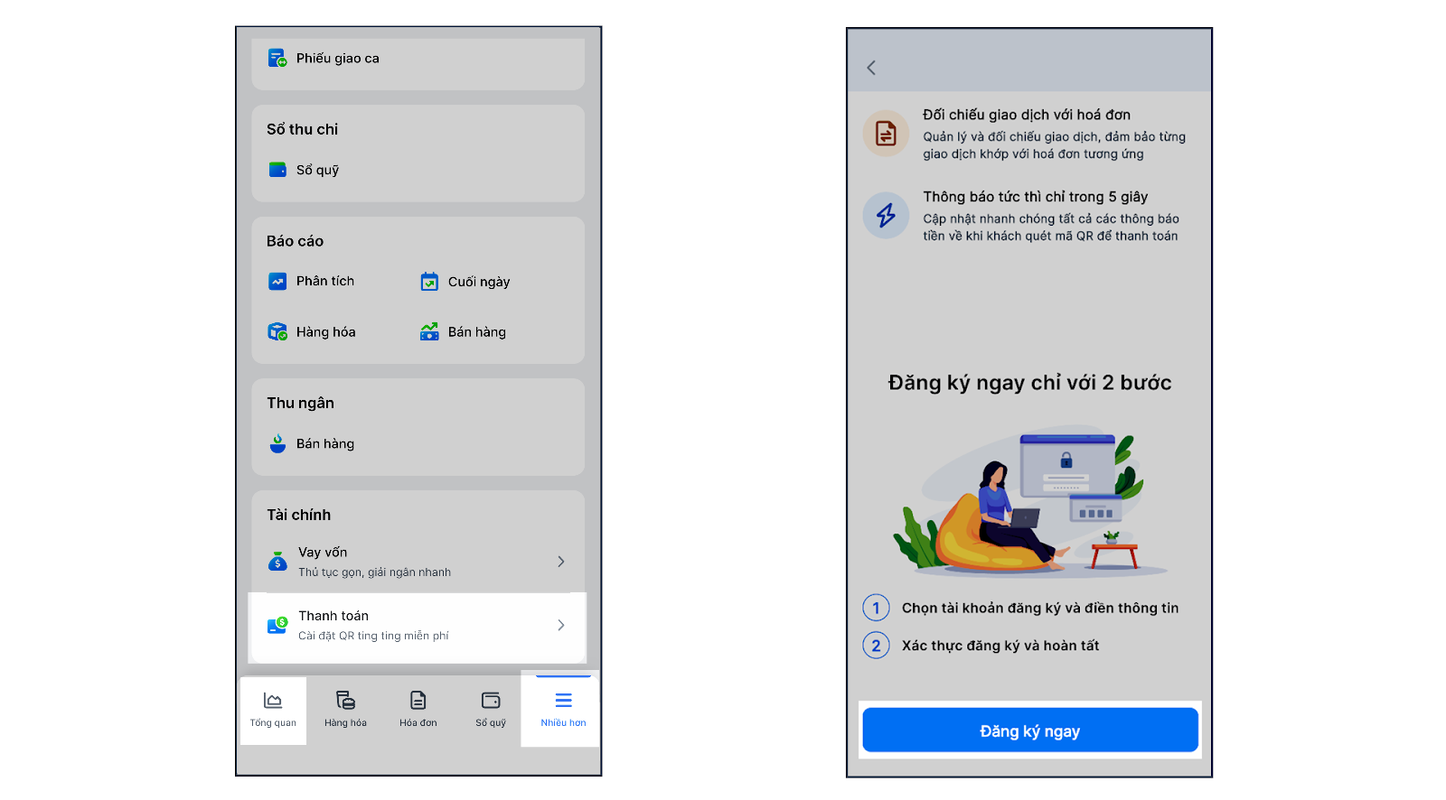 - Trên ứng dụng KiotViet Quản lý Nhà hàng, từ menu Nhiều hơn hoặc Tổng quan, bạn chọn mục Thanh toán → nhấn Đăng ký ngay.