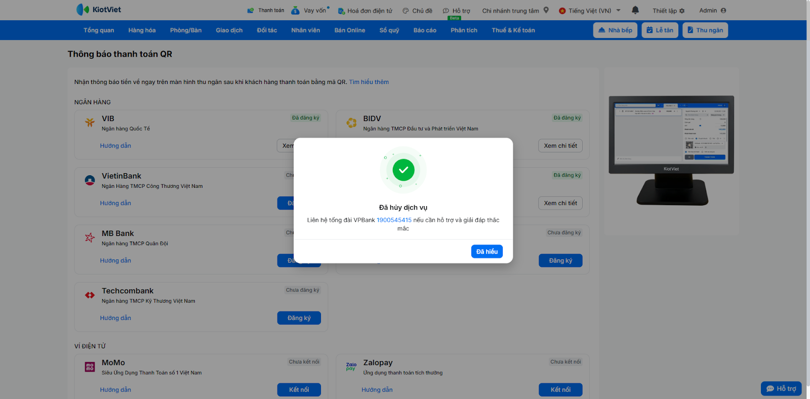 - Một gian hàng KiotViet tại một thời điểm chỉ có thể liên kết với một tài khoản VPBank duy nhất.