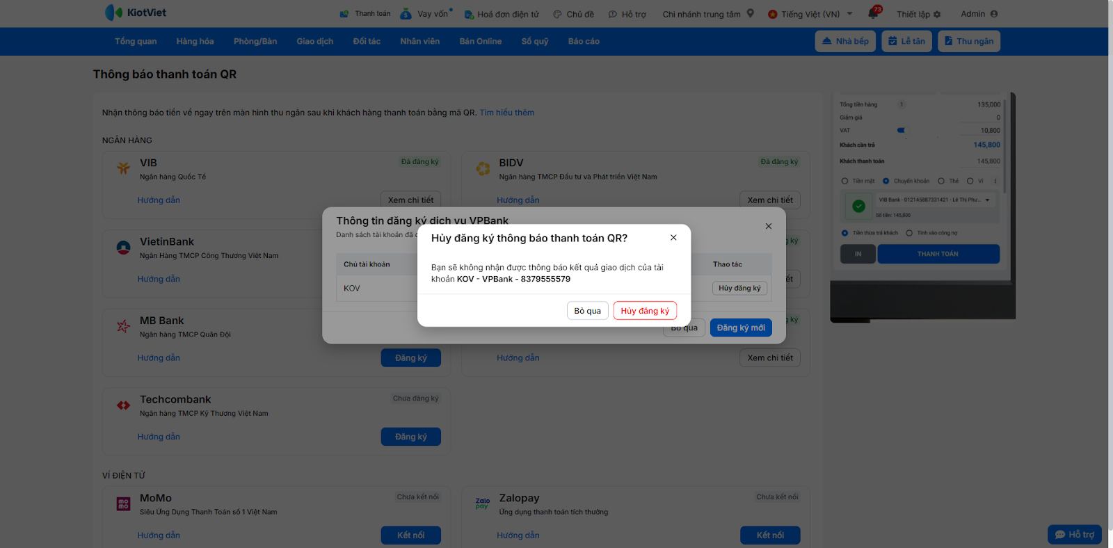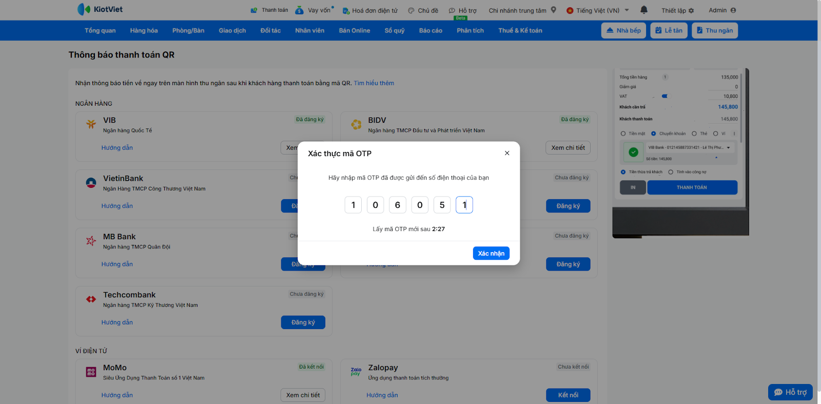 Để kích hoạt tính năng nhận thông báo thanh toán tự động, bạn cần đăng ký dịch vụ trực tiếp trên phần mềm KiotViet và xác thực bằng mã OTP.
