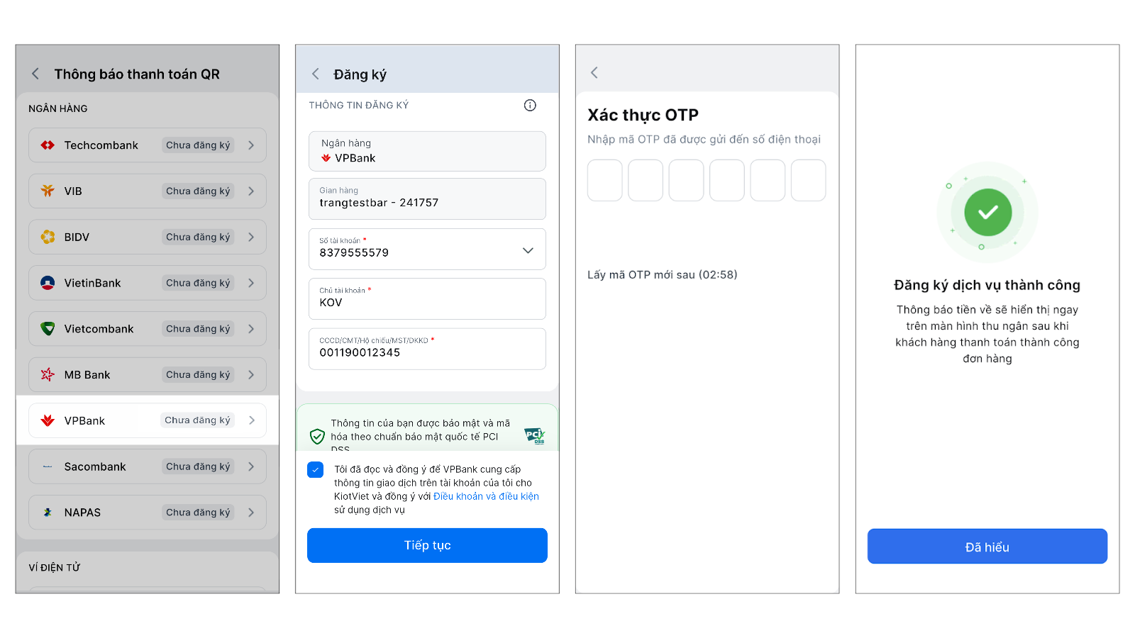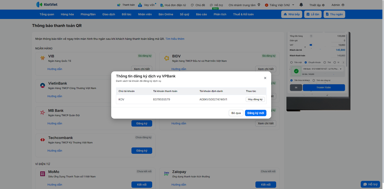 - Ngược lại, một tài khoản VPBank có thể được sử dụng để đăng ký dịch vụ cho nhiều gian hàng KiotViet khác nhau.
