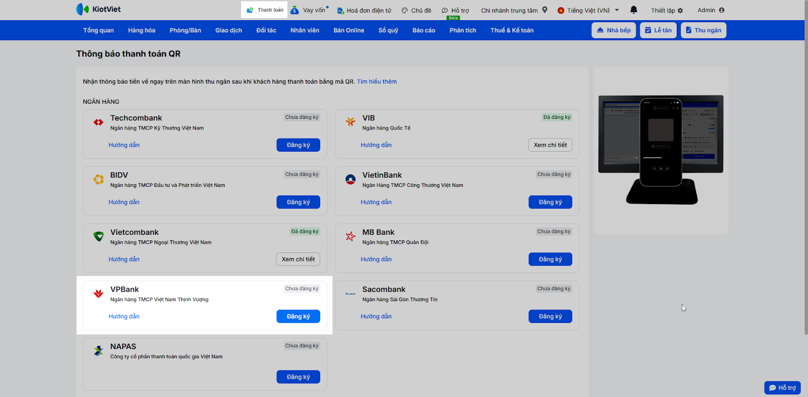 - Tài khoản admin của chủ gian hàng đăng nhập vào màn hình Quản lý, chọn mục Thanh toán và nhấn Đăng ký tại thẻ VPBank.