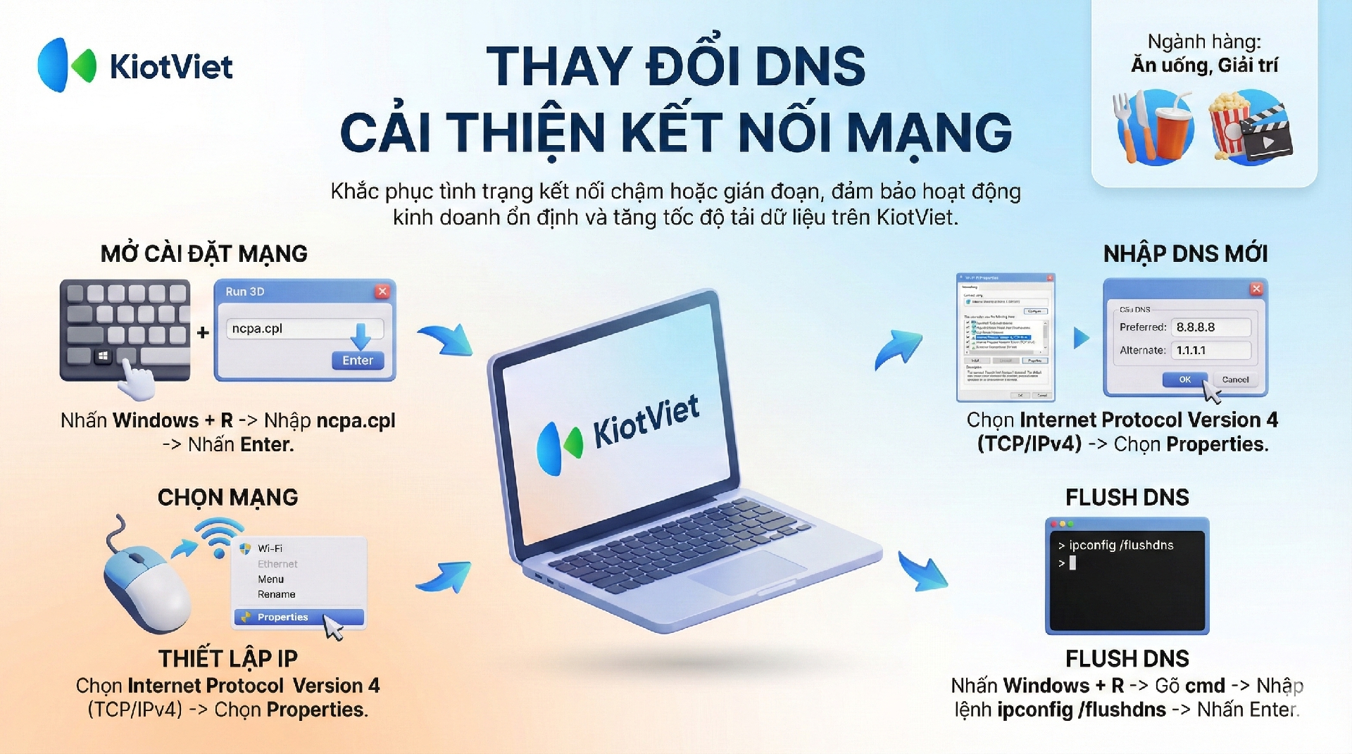 Trong một số trường hợp, hệ thống DNS (Domain Name System) mặc định của nhà cung cấp mạng có thể hoạt động không ổn định, dẫn đến tình trạng truy cập vào gian hàng KiotViet bị chậm hoặc gián đoạn. Việc thay đổi DNS sang các hệ thống công cộng tin cậy (như Google hoặc Cloudflare) sẽ giúp cải thiện tốc độ và sự ổn định khi kết nối.