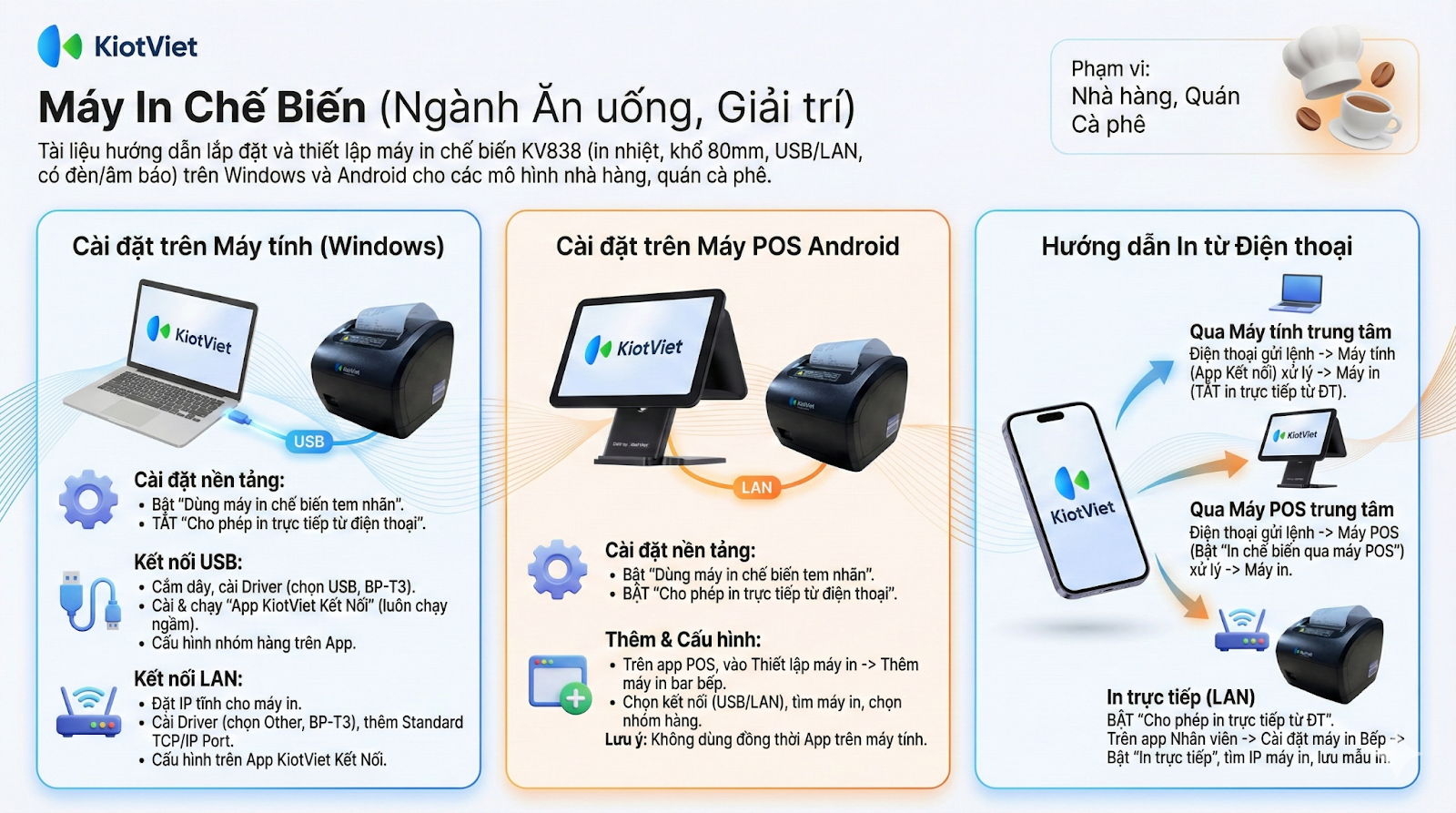 Tài liệu này cung cấp hướng dẫn chi tiết để lắp đặt và thiết lập máy in chế biến (in bar/bếp) KV838 và các dòng máy in nhiệt tương tự (khổ giấy 80mm). Hướng dẫn bao gồm các phương thức kết nối qua cổng USB, mạng LAN và các kịch bản vận hành khác nhau (sử dụng máy tính, máy POS làm trung tâm hoặc in trực tiếp từ điện thoại) để phù hợp với mọi mô hình nhà hàng, quán cà phê.