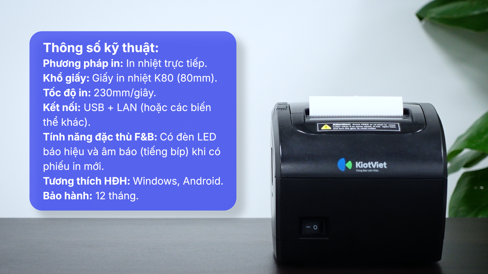 - Tính năng đặc thù F&B: Có đèn LED báo hiệu và âm báo (tiếng bíp) khi có phiếu in mới.