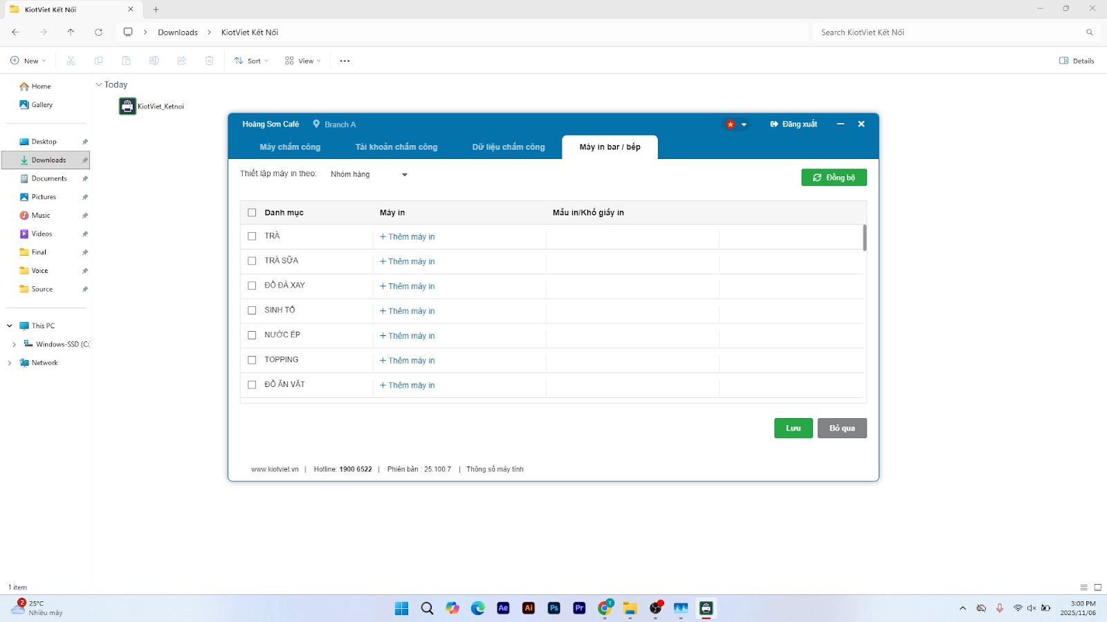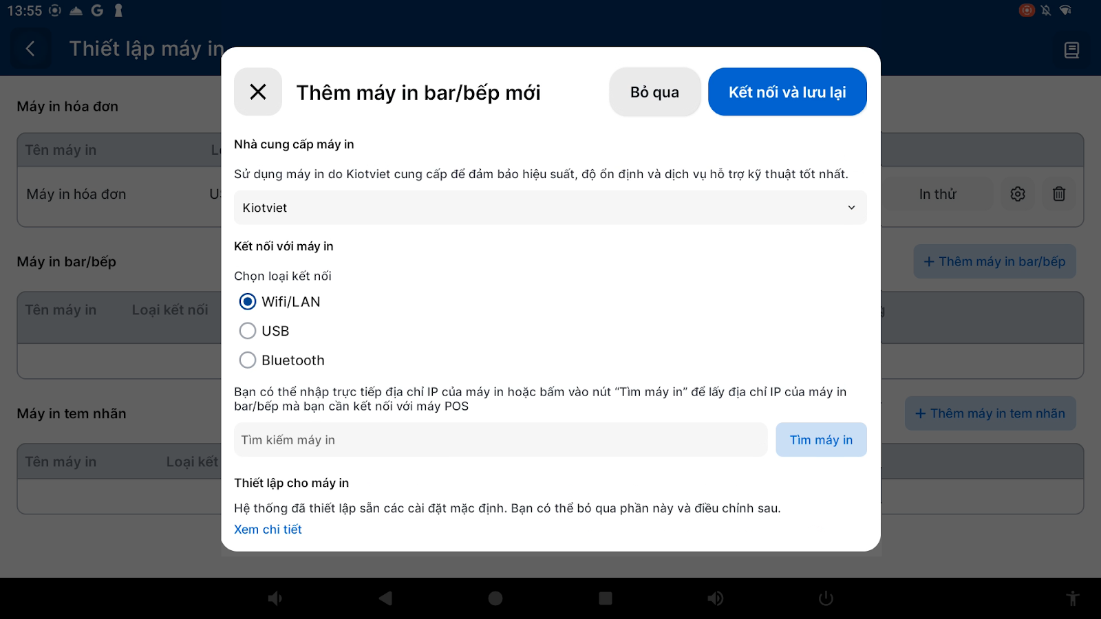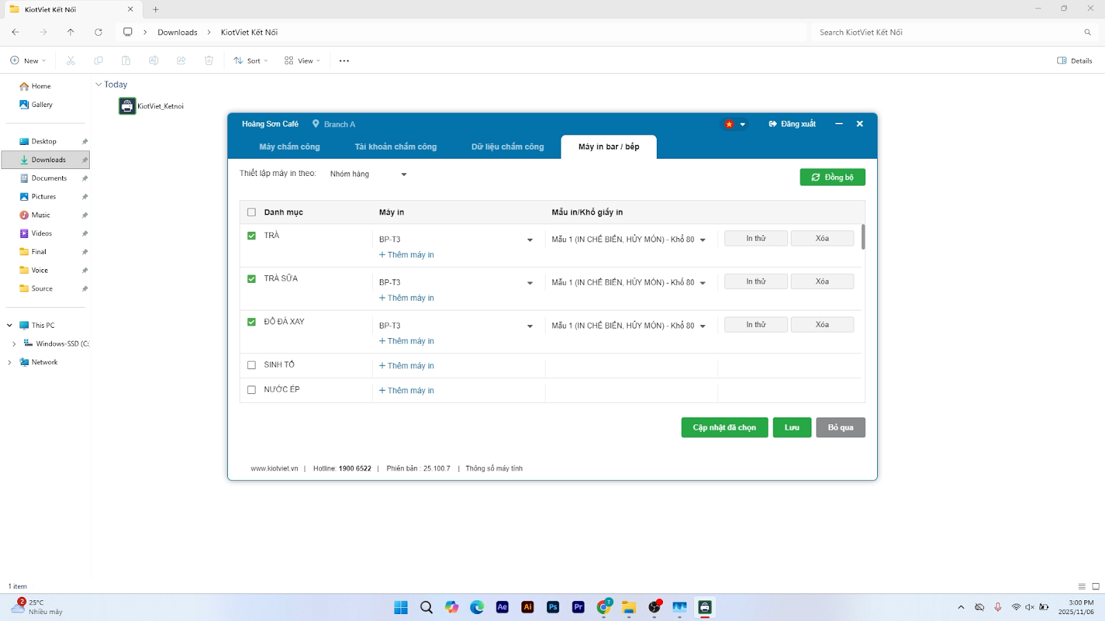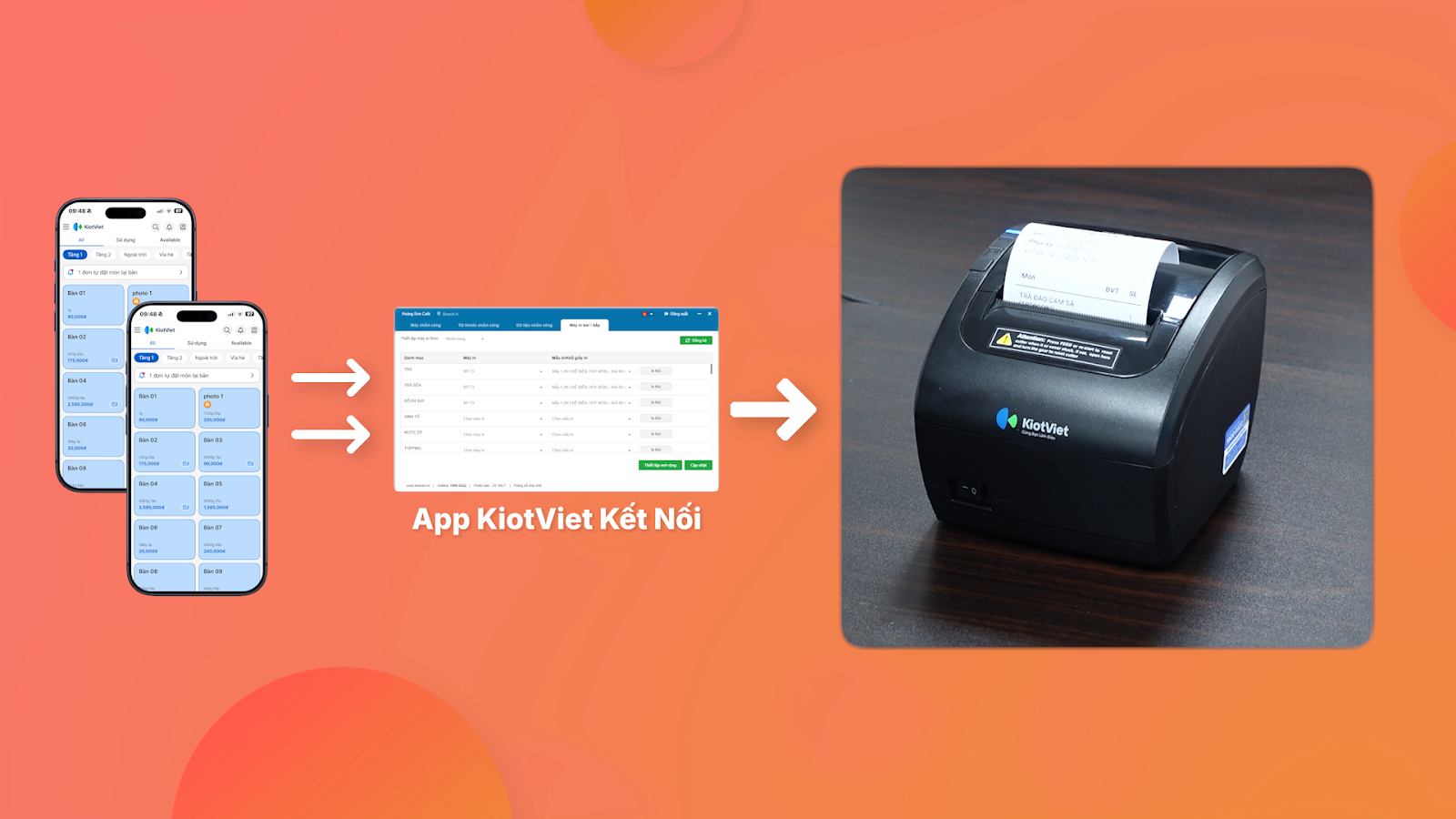 - Cấu hình App KiotViet Kết Nối: Thực hiện tương tự như khi kết nối USB, đảm bảo bạn chọn đúng tên máy in đã được cấu hình qua mạng LAN và gán các nhóm hàng tương ứng.