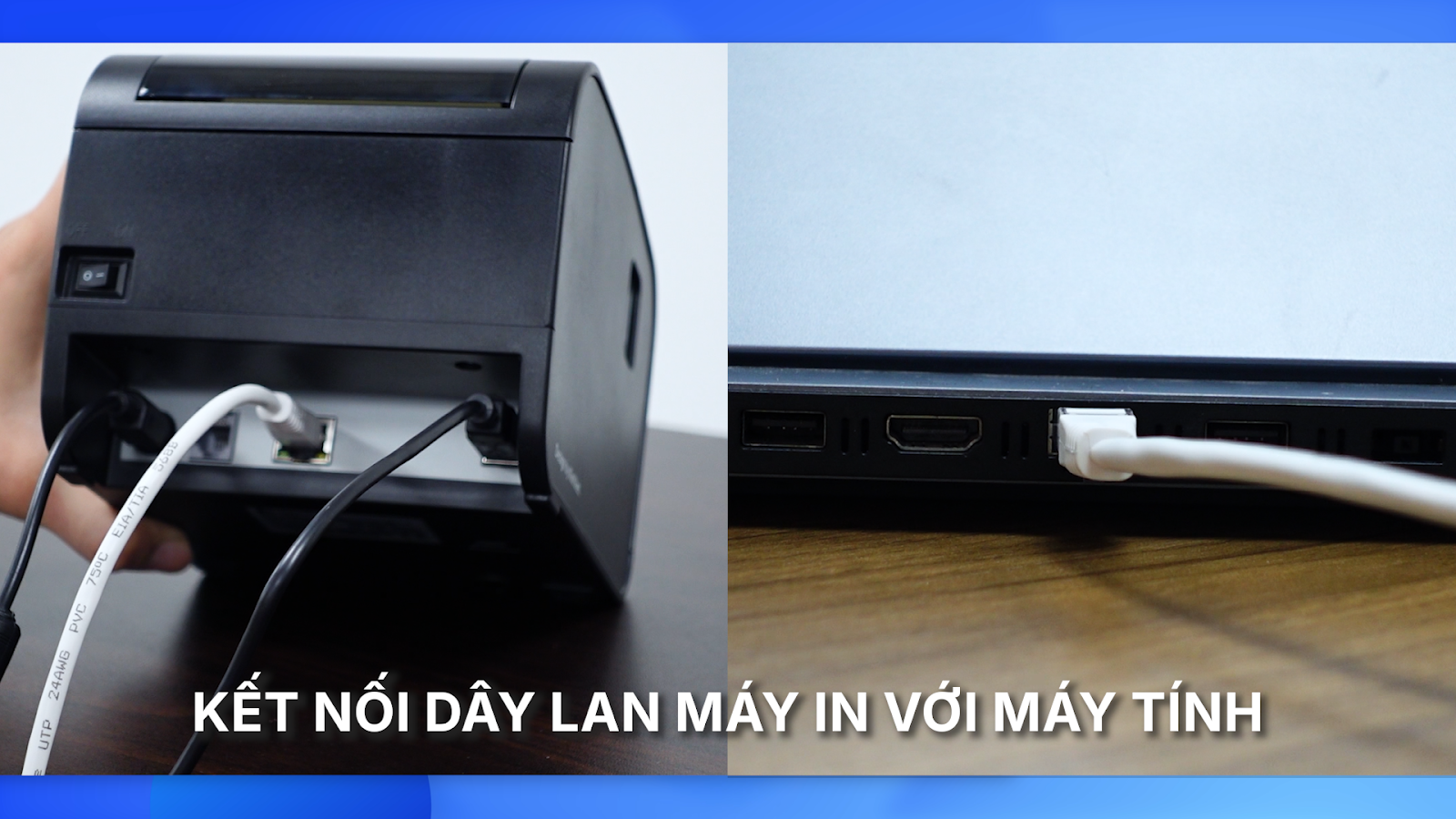 - Bước 2: Kết nối máy in và máy tính: Dùng dây LAN kết nối trực tiếp máy in với máy tính.