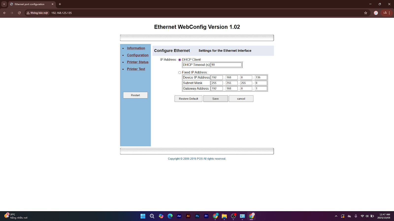 Trong trang cấu hình, đổi IP của máy in sang một IP cố định thuộc dải mạng LAN của cửa hàng (ví dụ: 192.168.0.220) và lưu lại.