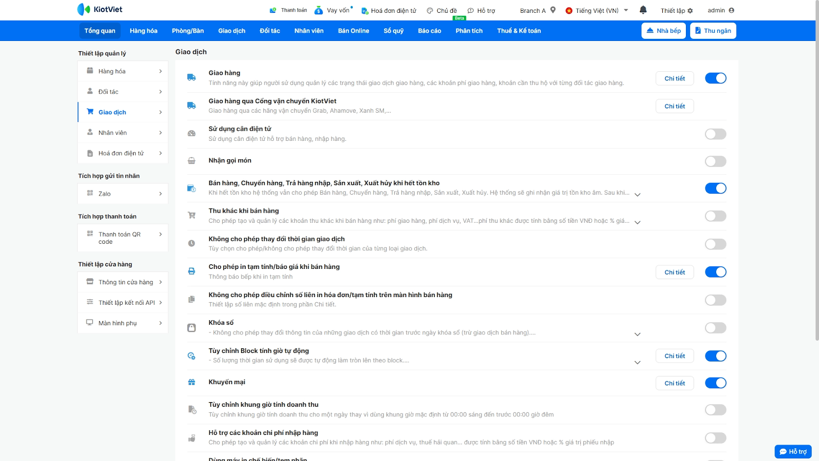 - Vào mục Thiết lập (biểu tượng bánh răng) -> Thiết lập cửa hàng -> tab Giao dịch.