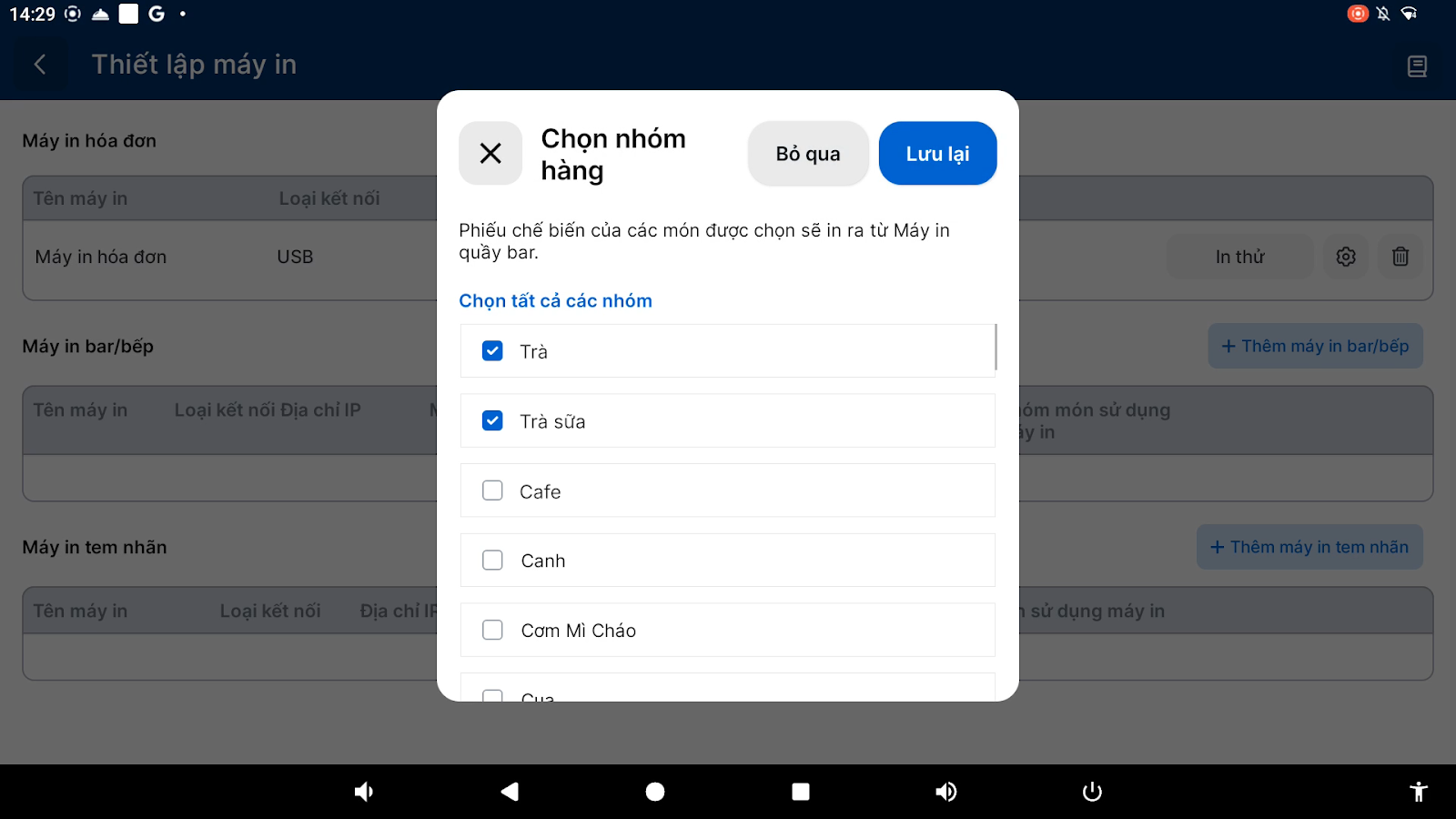 - Tích chọn các nhóm hàng (ví dụ: Món chính, Khai vị) mà bạn muốn máy in này phụ trách in.