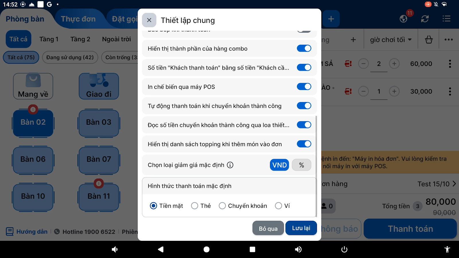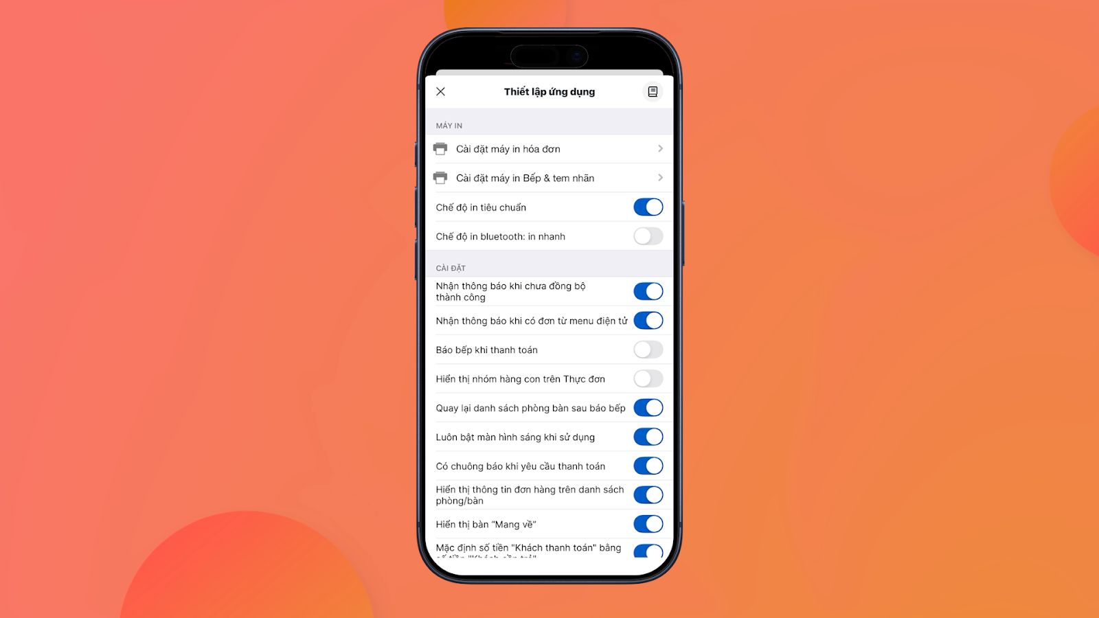 - Quan trọng: TẮT tùy chọn “Cho phép in bar, bếp trực tiếp từ điện thoại”.