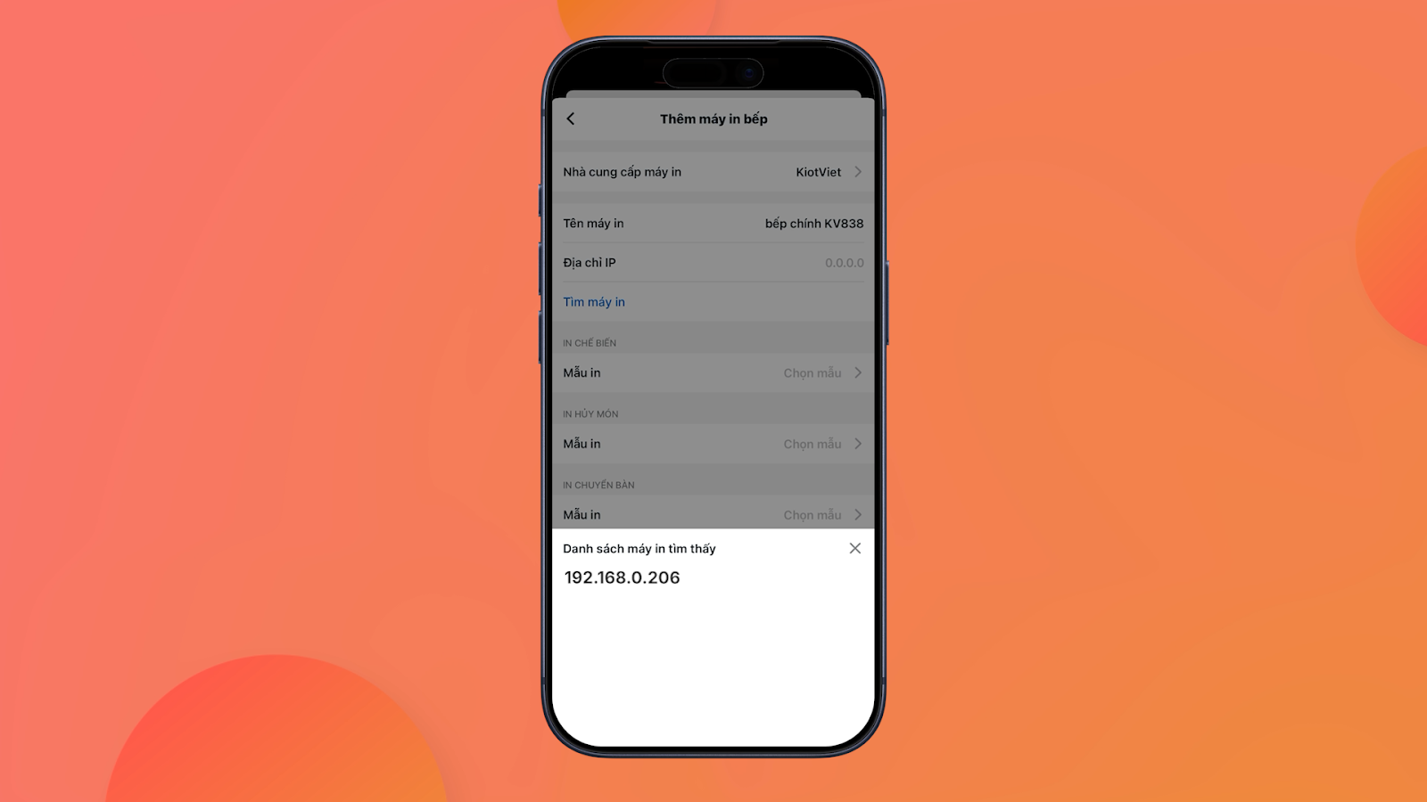 - Nhấn Tìm máy in để ứng dụng tự động quét và hiển thị IP của máy in trong mạng. Chọn đúng IP của máy in bếp.