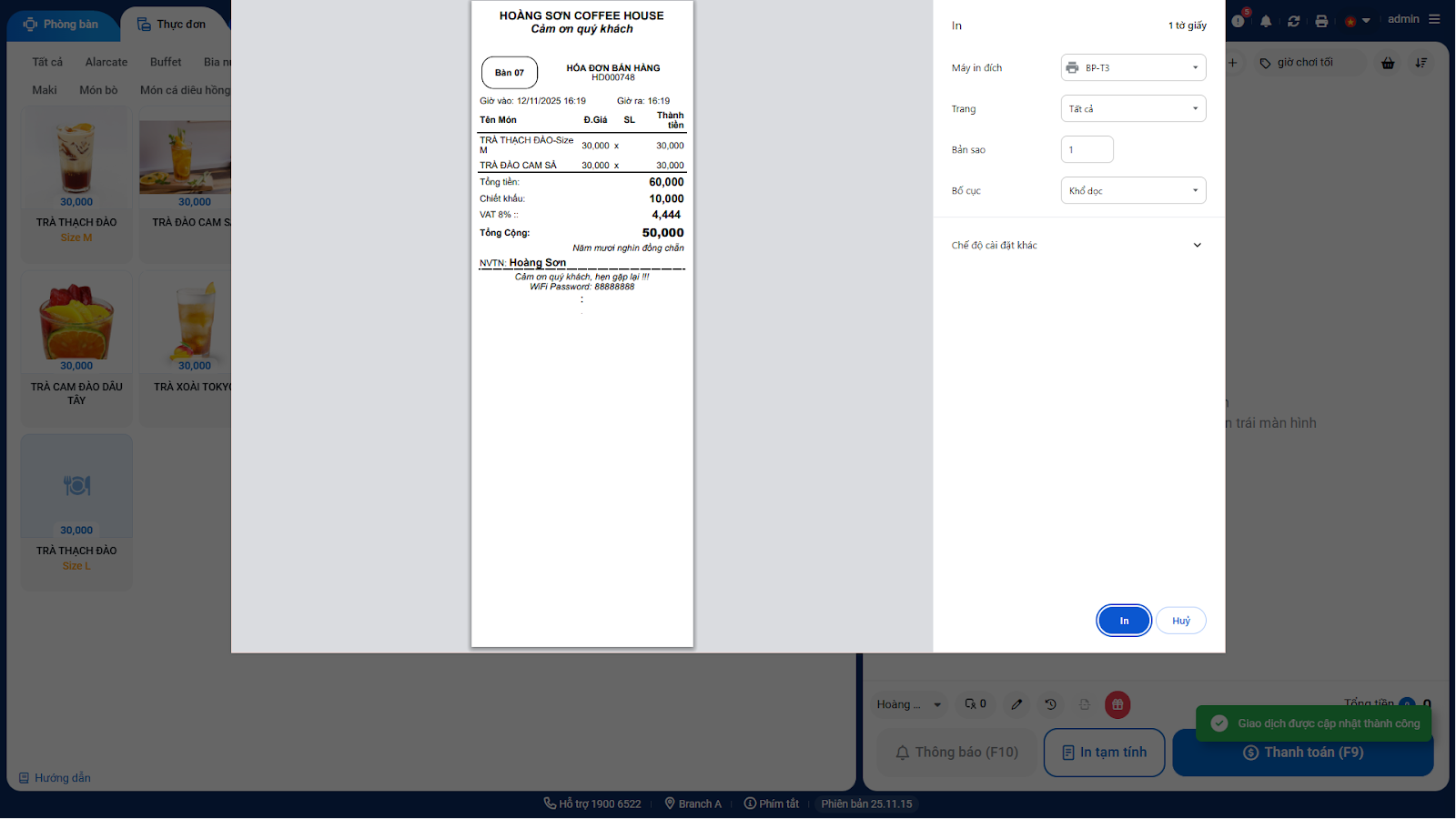 - Nhấn In (Print). Hóa đơn sẽ được in ra thành công.