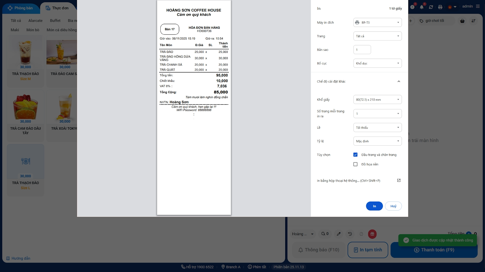- Tình huống: Sau khi cài đặt thành công, bạn cần thực hiện in thử một hóa đơn thực tế và cấu hình để tiết kiệm giấy in.