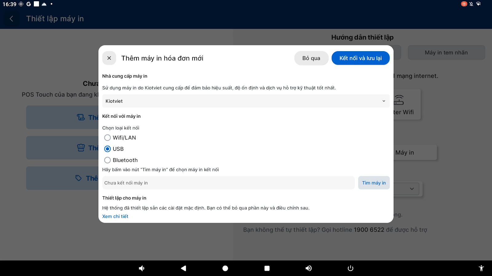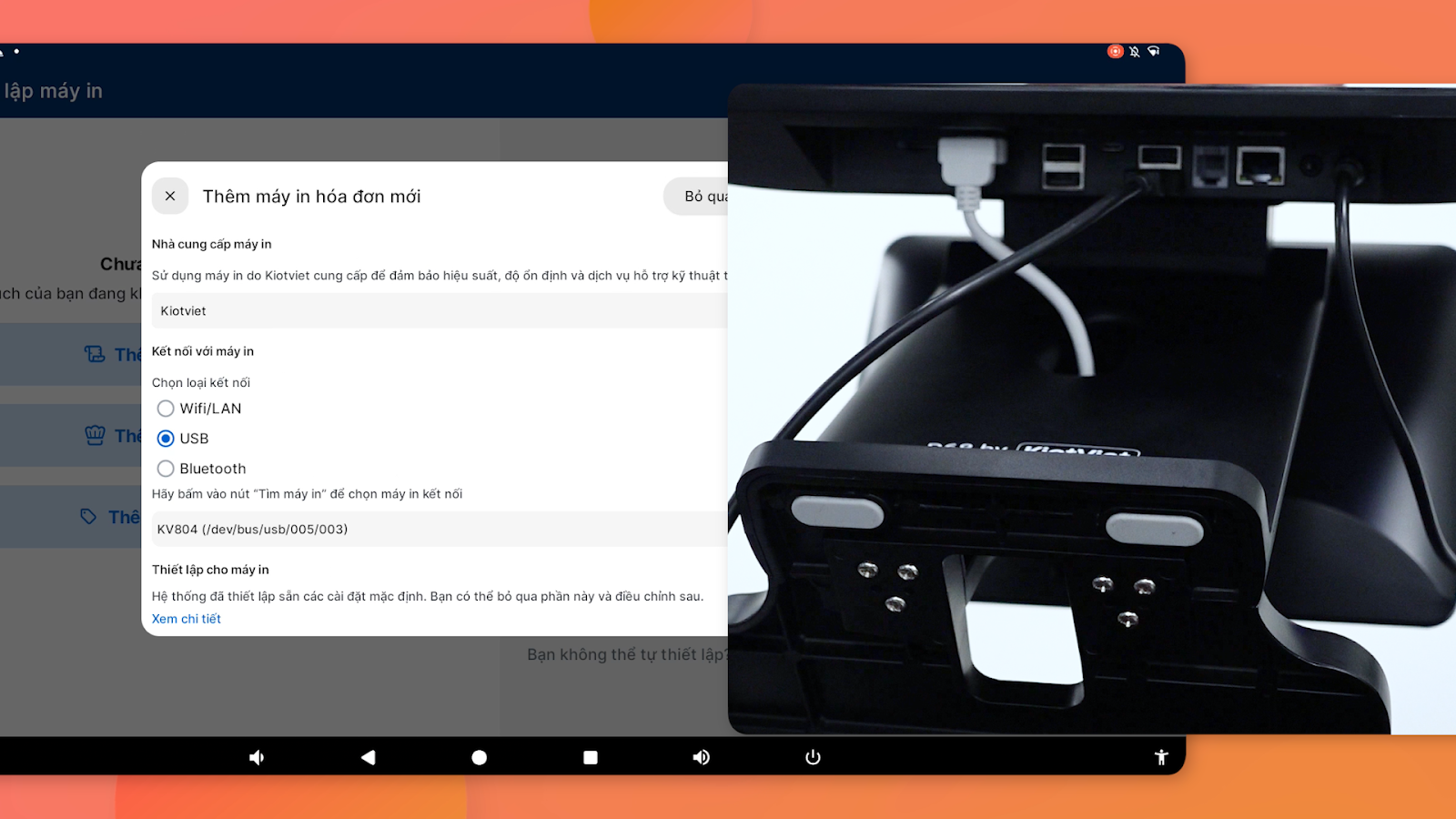- Chọn kết nối: Chọn nhà cung cấp (KiotViet) và loại kết nối (USB hoặc LAN).