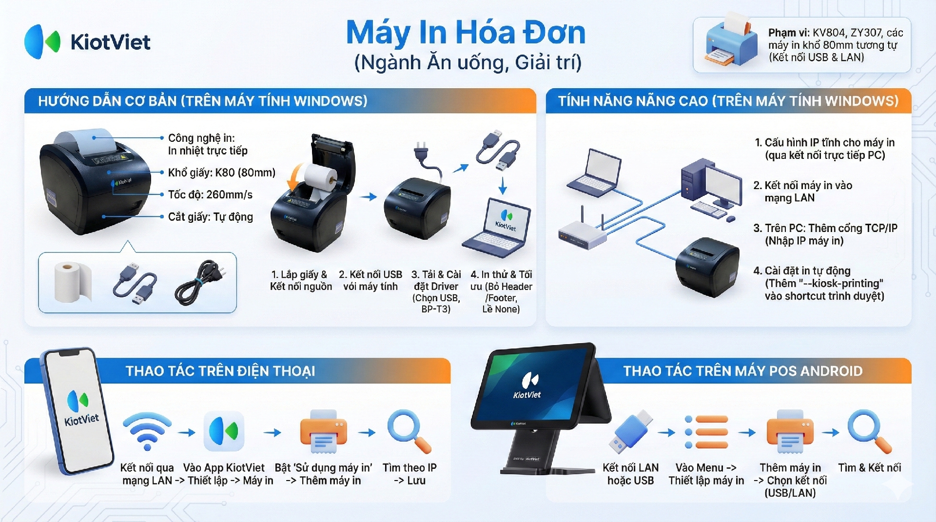 Tài liệu này cung cấp hướng dẫn chi tiết để lắp đặt và thiết lập các dòng máy in hóa đơn nhiệt phổ biến do KiotViet cung cấp, bao gồm KV804, ZY307, và các dòng máy in tương tự (khổ giấy 80mm). Hướng dẫn bao gồm cả phương thức kết nối qua cổng USB và mạng LAN, giúp bạn dễ dàng tích hợp máy in vào hệ thống bán hàng của mình.