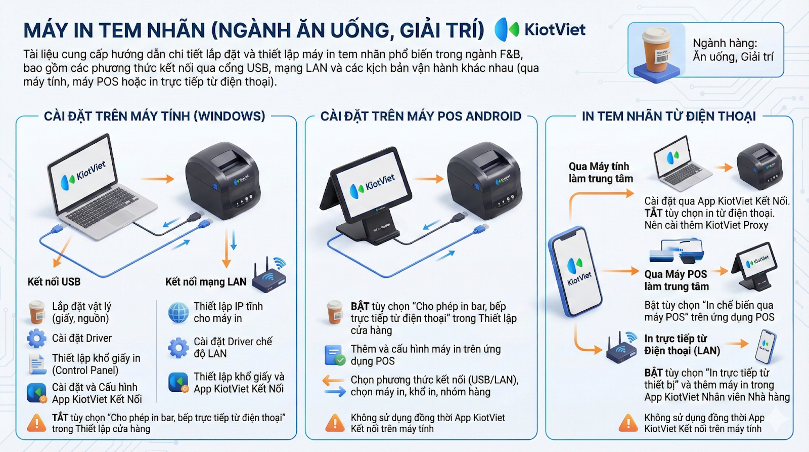Tài liệu này cung cấp hướng dẫn chi tiết để lắp đặt và thiết lập máy in tem nhãn (in tem dán ly) phổ biến trong ngành F&B, minh họa với dòng máy in 365B và các máy tương tự. Hướng dẫn bao gồm các phương thức kết nối qua cổng USB, mạng LAN và các kịch bản vận hành khác nhau (sử dụng máy tính, máy POS làm trung tâm hoặc in trực tiếp từ điện thoại) để phù hợp với mọi mô hình quán trà sữa, cà phê.